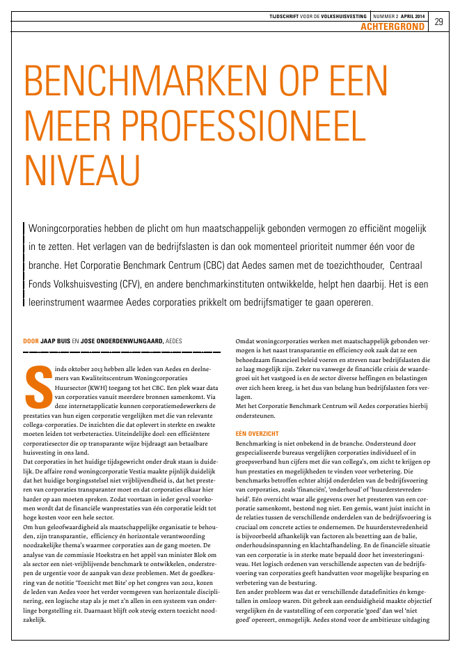 Woningcorporaties hebben de plicht om hun maatschappelijk gebonden vermogen zo efficiënt mogelijk in te zetten. Het verlagen van de bedrijfslasten is dan ook momenteel prioriteit nummer één voor de branche. Het Corporatie Benchmark Centrum (CBC) dat Aedes samen met de toezichthouder, Centraal Fonds Volkshuisvesting (CFV), en andere benchmarkinstituten ontwikkelde, helpt hen daarbij. Het is een leerinstrument waarmee Aedes corporaties prikkelt om bedrijfsmatiger te gaan opereren.