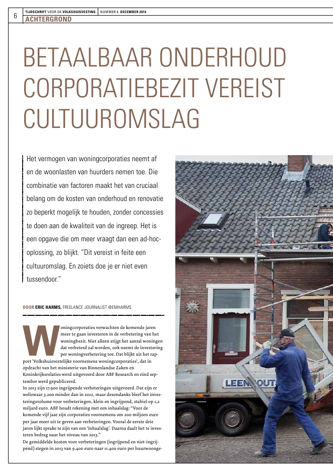 6TIJDSCHRIFT VOOR DE VOLKSHUISVESTING NUMMER 6 DECEMBER 2014BETAALBAAR ONDERHOUDCORPORATIEBEZIT VEREISTCULTUUROMSLAGHet vermogen van woningcorporaties neemt afen de woonlasten van huurders nemen toe. Diecombinatie van factoren maakt het van cruciaalbelang om de kosten van onderhoud en renovatiezo beperkt mogelijk te houden, zonder concessieste doen aan de kwaliteit van de ingreep. Het iseen opgave die om meer vraagt dan een ad-hoc-oplossing, zo blijkt. "Dit vereist in feite eencultuuromslag. En zoiets doe je er niet eventussendoor."ACHTERGRONDDOOR ERIC HARMS, FREELANCE JOURNALIST @EMHARMSWoningcorporaties verwachten de komende jarenmeer te gaan investeren in de verbetering van hetwoningbezit. Niet alleen stijgt het aantal woningendat verbeterd zal worden, ook neemt de investeringper woningverbetering toe. Dat blijkt uit het rap-port 'Volkshuisvestelijke voornemens woningcorporaties', dat inopdracht van het ministerie van Binnenlandse Zaken enKoninkrijksrelaties werd uitgevoerd door ABF Research en eind sep-tember werd gepubliceerd.In 2013 zijn 17.900 ingrijpende verbeteringen uitgevoerd. Dat zijn erweliswaar 3.200 minder dan in 2012, maar desondanks bleef het inves-teringsvolume voor verbeteringen, klein en ingrijpend, stabiel op 1,2miljard euro. ABF houdt rekening met een inhaalslag: "Voor dekomende vijf jaar zijn corporaties voornemens om 200 miljoen europer jaar meer uit te geven aan verbeteringen. Vooral de eerste driejaren lijkt sprake te zijn van een `inhaalslag'. Daarna daalt het te inves-teren bedrag naar het niveau van 2013."De gemiddelde kosten voor verbeteringen (ingrijpend en niet-ingrij-pend) stegen in 2013 van 9.400 euro naar 11.400 euro per huurwoonge-7TIJDSCHRIFT VOOR DE VOLKSHUISVESTING NUMMER 6 DECEMBER 2014ACHTERGRONDlegenheid. Ook hier wordt rekening gehouden met een toename. "Voorde periode 2014-2018 gaan corporaties ervanuit dat de gemiddelde kos-ten per verbetering stijgen tot 14.700 euro. Deze stijging hangt moge-lijk samen met het feit dat corporaties de komende jaren hun bezitminder vernieuwen via nieuwbouw en sloop, maar de kwaliteit vanhun bestaande woonvastgoed op peil houden door extra verbeterin-gen."STIJGENDE WOONLASTENHuurders op hun beurt komen steeds vaker in de problemen door stij-gende woonlasten, zo bleek eind oktober nog uit het rapport`Kwetsbaarheid van regionale woningmarkten - Financi?le risico's vanhuishoudens en hun toegang tot de woningmarkt', dat is opgestelddoor het Planbureau voor de Leefomgeving (PBL).Volgens het PBL hebben steeds meer huurders een inkomen dat ontoe-reikend is voor de netto huur en de kosten van levensonderhoud. "In2012 had 13 procent van de huurders een betaalrisico; een verdubbelingten opzichte van 2002. In absolute aantallen hadden in 2012 circa384.000 huurders een betaalrisico; drie keer zo veel als onder eigenaar-bewoners. Sociale huurwoningen worden steeds meer bewoond doorhuishoudens met een laag inkomen met een huurtoeslag. Juist dezehuishoudens hebben vaker een betaalrisico. Had in 2002 `slechts' 6procent van de huurtoeslagontvangers een betaalrisico, in 2012 was ditopgelopen tot circa 21 procent."De economische crisis is een van de voornaamste oorzaken. "Door detoenemende werkloosheid en achterblijvende loonontwikkeling zijn ersteeds meer huurders van wie het inkomen niet langer toereikend is."Maar ook de gestegen huurprijzen spelen een rol. "Het is denkbaar datDegemiddeldekostenvoorverbeteringen(ingrijpendenniet-ingrijpend)stegenin2013van9.400euronaar11.400europerhuurwoongelegenheid(Foto:WerryCrone/HollandseHoogte)8TIJDSCHRIFT VOOR DE VOLKSHUISVESTING NUMMER 6 DECEMBER 2014de recente jaarlijkse huurverhogingen, die boven de inflatie mogenuitstijgen, voor sommige huurders de welbekende druppel zijn, vooralvoor huurders die n?t niet (meer) in aanmerking komen voor huurtoe-slag."Voeg daaraan toe het feit dat de vermogenspositie en verdiencapaciteitvan woningcorporaties door onder andere de verhuurdersheffing ende situatie op de woningmarkt flink zijn aangetast, en het is duidelijkdat corporaties alle reden hebben om zich te buigen over de vraag hoehet onderhoud van de woningvoorraad zo goed maar ook zo goedkoopmogelijk kan worden uitgevoerd."Je moet niet gelijk achter de euro's aanhollen,maar de tijd nemen om elkaars rollen enstandpunten te begrijpen"INITIATIEF TOT VERNIEUWINGSteeds meer woningcorporaties beraden zich inmiddels op de vraaghoe deze doelstelling kan worden bereikt en nemen het initiatief totvernieuwing. Bijvoorbeeld door te investeren in duurzaamheidsmaat-regelen. Hiermee kunnen immers de kosten van een ingreep (deels) viade energierekening worden terugverdiend. Dat is onder andere hetstreven van de in de zomer van 2013 gesloten deal `Stroomversnelling'.In dat kader doen vier bouwers en zes woningcorporaties ervaring opmet het duurzaam renoveren van 11.000 woningen, en op termijn zelfs111.000 woningen, zodanig dat de woonlasten voor de huurders in demeeste gevallen gelijk zullen blijven. Volgens de initiatiefnemers kandit worden bereikt door huurders hun energielasten te laten betalenaan hun corporatie. De opbrengst daarvan investeren de corporatiesvervolgens in de renovatie van de woningen, waarvoor de bouwers ophun beurt duurzaam gerenoveerde nul-energiewoningen opleveren.Ketensamenwerking trekt, naast innovatieve contractvormen, even-eens de aandacht. Dat bleek wel uit het grote aantal deelnemers aanhet congres `Ketensamenwerking in de renovatiemarkt', dat eind sep-tember werd gehouden door Aedes, UNETO-VNI, OnderhoudNL enBouwend Nederland. De voornaamste horde die opdrachtgevers enopdrachtnemers moeten nemen om succesvol te kunnen samenwer-ken is het onderlinge wantrouwen, zo bleek. Daarom is het van belangdat de diverse partijen elkaars beelden delen, vertrouwen in elkaarhebben en de wederzijdse belangen snappen, merkte een van de spre-kers op. "Je moet niet gelijk achter de euro's aanhollen, maar de tijdnemen om elkaars rollen en standpunten te begrijpen." Op hetzelfdecongres sprak Bas Sievers 