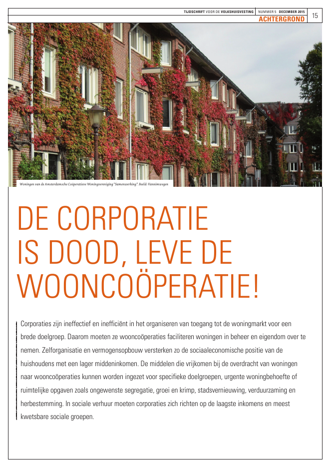Corporaties zijn ineffectief en inefficiënt in het organiseren van toegang tot de woningmarkt voor een brede doelgroep. Daarom moeten ze wooncoöperaties faciliteren woningen in beheer en eigendom over te nemen. Zelforganisatie en vermogensopbouw versterken zo de sociaaleconomische positie van de huishoudens met een lager middeninkomen. De middelen die vrijkomen bij de overdracht van woningen naar wooncoöperaties kunnen worden ingezet voor specifieke doelgroepen, urgente woningbehoefte of ruimtelijke opgaven zoals ongewenste segregatie, groei en krimp, stadsvernieuwing, verduurzaming en herbestemming. In sociale verhuur moeten corporaties zich richten op de laagste inkomens en meest kwetsbare sociale groepen.