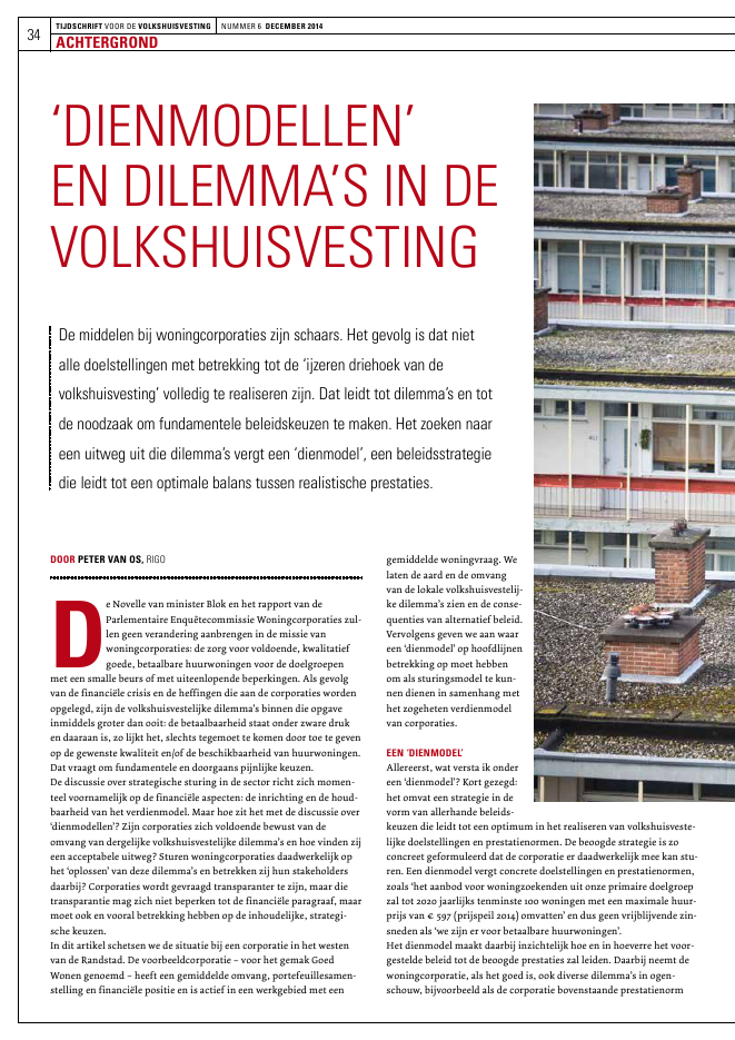 De middelen bij woningcorporaties zijn schaars. Het gevolg is dat niet alle doelstellingen met betrekking tot de ‘ijzeren driehoek van de volkshuisvesting’ volledig te realiseren zijn. Dat leidt tot dilemma’s en tot de noodzaak om fundamentele beleidskeuzen te maken. Het zoeken naar een uitweg uit die dilemma’s vergt een ‘dienmodel’, een beleidsstrategie die leidt tot een optimale balans tussen realistische prestaties.