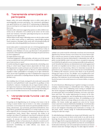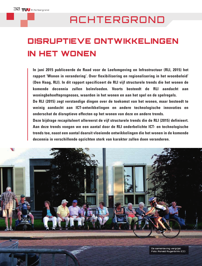 30 ? AchtergrondACHTERGRONDDISRUPTIEVE ONTWIKKELINGENIN HET WONENIn juni 2015 publiceerde de Raad voor de Leefomgeving en Infrastructuur (RLI, 2015) hetrapport `Wonen in verandering'. Over flexibilisering en regionalisering in het woonbeleid'(Den Haag, RLI). In dit rapport specificeert de RLI vijf structurele trends die het wonen dekomende decennia zullen be?nvloeden. Voorts besteedt de RLI aandacht aanwoningbehoefteprognoses, waarden in het wonen en aan het spel en de spelregels.De RLI (2015) zegt verstandige dingen over de toekomst van het wonen, maar besteedt teweinig aandacht aan ICT-ontwikkelingen en andere technologische innovaties enonderschat de disruptieve effecten op het wonen van deze en andere trends.Deze bijdrage recapituleert allereerst de vijf structurele trends die de RLI (2015) definieert.Aan deze trends voegen we een aantal door de RLI onderbelichte ICT- en technologischetrends toe, naast een aantal daaruit vloeiende ontwikkelingen die het wonen in de komendedecennia in verschillende opzichten sterk van karakter zullen doen veranderen.De samenleving vergrijst.Foto: Ronald Rugenbrink (CC)31? Maart 2016DOOR HUGO PRIEMUSDit artikel is een bewerking van de gelijknamige inleiding van de auteur op3 november 2015 tijdens het Wooncongres van Platform 31 enOnderzoeksinstituut OTB, Den Haag.1. Vijf structurele trendsvolgens RLI (2015)RLI (2015: 37-40) benoemt de vijf belangrijkste trends met een blijvend enbepalend effect op de woonbehoefte in de toekomst.a. Toenemende diversiteit en flexibiliteit in de vraagAllereerst is de individualisering van de burger een drijvende kracht op dewoningmarkt. Hoewel er nog steeds een standaardwooncarri?re kan wor-den waargenomen, zijn de huishoudenssamenstellingen en de levenslopensteeds minder voorspelbaar. Naast eenpersoonshuishoudens zien we LAT-relaties, patchwork families (samengestelde gezinnen na een scheiding) enmeerhuizigheid. Deze ontwikkelingen monden uit in een grotere diversiteiten een grotere behoefte aan flexibiliteit.b. Structurele onzekerheid werk en wonenHet `nieuwe werken', open grenzen voor arbeidsmigranten, meer zzp'ers,faillissementen en overnames van bedrijven, loonoffers, demotie en versoe-peling van het ontslagrecht cre?ren onzekerheid over de hoogte van hetinkomen en de locatie van het werk. Vooral tijdens de financieel-economi-sche crisis manifesteren zich deze verschijnselen.c. Flexibele schil op de woningmarktVoor vele woningzoekenden is een hypotheek onbereikbaar, de wachttijd voor eensocialehuurwoningtegrooteneenparticulierehuurwoningteduur.Alternatievenzijn: tijdelijke huurcontracten, onderverhuur, woningdeling en antikraak. Ditvergroot het herbergend vermogen van de woningvoorraad in grote steden.d. Innovatie vanuit de praktijkDe technologie ontwikkelt zich stormachtig: het internet of things, flexibelwoningontwerp, het inperken van het energiegebruik (zoals de nul-op-de-meterwoning). Dit heeft invloed op zowel de woningvoorraad als de nieuw-bouw. In het bouw- en ontwerpproces bieden bouwinformatiemanagement(BIM), prefab beton en het 3D-printen perspectieven. Bouwtijdverkorting enbouwkostenreductie worden nagestreefd.e. Toenemende regionale verschillenDe verschillen tussen krimp en groei tussen en binnen regio's nemen toe.RLI (2015: 40) spreekt over `een Nederland van twee snelheden'. Steden doenhet op dit ogenblik beter dan het platteland.Naar onze mening is dit overzicht van RLI (2015) analytisch weinig bevredi-gend en worden ontwikkelingen als de ICT-revolutie, de klimaatverande-ring en de energietransitie onderbelicht. Bovendien worden de disruptieveeffecten op het wonen onderschat.2. Drie klassieke determinantenvan het wonenAlswedeveranderingeninhetwonenindeafgelopeneeuwendoordeoogharenbekijken, kunnen we de volgende klassieke determinanten onderscheiden:n Demografische en sociaal-culturele determinanten: natuurlijke aanwas,immigratie, meer scheidingen, meer ongehuwd samenwonenden, meercomplexe gezinnen, LAT-relaties, voortschrijdende gezinsverdunning,individualisering, etnische en religieuze differentiatie, vergrijzing enontgroening ? dit alles leidend tot een dalend herbergend vermogen vande woningvoorraad in de afgelopen decennia.n Economische determinanten: toenemende welvaart, opbouw en herdefi-ni?ring van verzorgingsarrangementen (pensioen, zorg, onderwijs), ver-anderende arbeidsmarkten, toenemende flexibiliteit op de arbeidsmarkt,meer ondernemerschap (inclusief zzp'ers), meer onzekerheden en risi-co's, een toenemende vermogensongelijkheid.n Technologische determinanten: tussen 1870 en 1900 braken drie groteindustri?le innovaties door: elektriciteit, de benzinemotor en waterlei-ding plus riolering. Deze General Purpose Technologies hebben veel invloedgehad. We zien toenemende verbindingen van de woning met infrastruc-tuurnetwerken zoals water, energie en telecom. Sinds kort nemen we eenvoorzichtige groei waar van hernieuwbare energie in woning en woon-omgeving.De veronderstelling ligt voor de hand dat de demografische, sociaal-cultu-rele, economische en technologische determinanten ook in de komendedecennia de ontwikkelingen van het wonen opnieuw zullen bepalen.Maar met de geleidelijkheid van deze ontwikkelingen en de gevolgen voorhet wonen lijkt het gedaan. De genoemde determinanten veranderen nu zosnel, in onderlinge wisselwerking, dat meer en meer disrupties in hetwonen moeten worden verwacht: vertrouwde patronen in het wonen wor-den afgebroken en nieuwe patronen manifesteren zich. Daarbij neemt debestaande woningvoorraad in gewicht toe. Nog meer dan in het recenteverleden is het de opgave om de bestaande voorraad en de onstuimige ont-wikkelingen in het wonen met elkaar in overeenstemming te brengen. Datstelt eisen aan de aanpasbaarheid van de woning, maar ook voorwaardenaan de wijze waarop demografische, sociaal-culturele, economische entechnologische veranderingen worden geaccommodeerd. Vooral de ICT-revolutie, klimaatverandering en energietransitie zullen revolutionaireeffecten op het wonen hebb