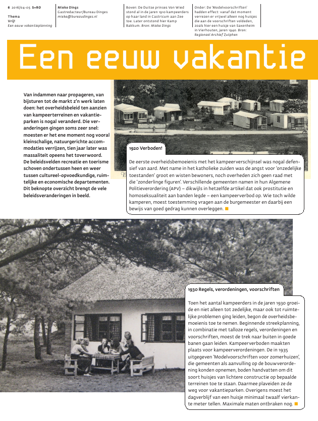 Van indammen naar propageren, van bijsturen tot de markt z’n werk laten doen: het overheidsbeleid ten aanzien van kampeerterreinen en vakantieparken is nogal veranderd. Die veranderingen gingen soms zeer snel: moesten er het ene moment nog vooral kleinschalige, natuurgerichte accommodaties verrijzen, tien jaar later was massaliteit opeens het toverwoord. De beleidsvelden recreatie en toerisme schoven ondertussen heen en weer tussen cultureel-opvoedkundige, ruimtelijke en economische departementen. Dit beknopte overzicht brengt de vele beleidsveranderingen in beeld.