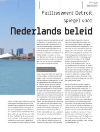 Detroit viert dat er een plan is om de schuld van 18 miljard dollar te saneren. Een doorstart voor de stad die sinds de grand bargain in financiële problemen verkeert. Maar is er wel reden voor een feestje? Veel van het optimisme berust volgens Brian Doucet op verkeerde aannames; de structurele problemen die het faillissement veroorzaakten worden niet opgelost. Detroit vormt hiermee een spiegel voor het Nederlands beleid waarin concurrentie tussen gemeenten groeit en herverdeling van belastinggeld steeds minder vanzelfsprekend is.
