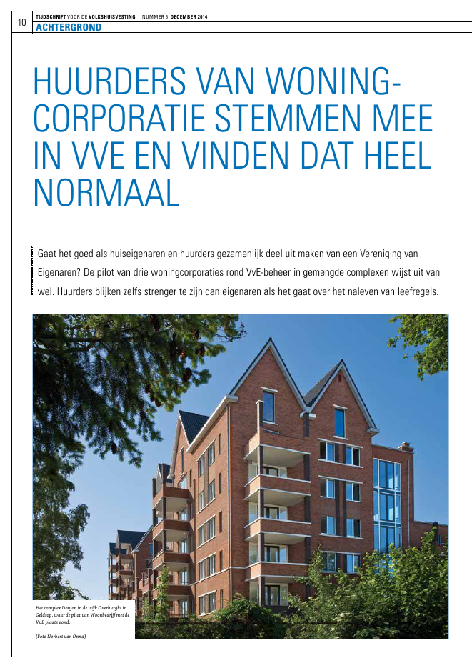 Gaat het goed als huiseigenaren en huurders gezamenlijk deel uit maken van een Vereniging van Eigenaren? De pilot van drie woningcorporaties rond VvE-beheer in gemengde complexen wijst uit van wel. Huurders blijken zelfs strenger te zijn dan eigenaren als het gaat over het naleven van leefregels.