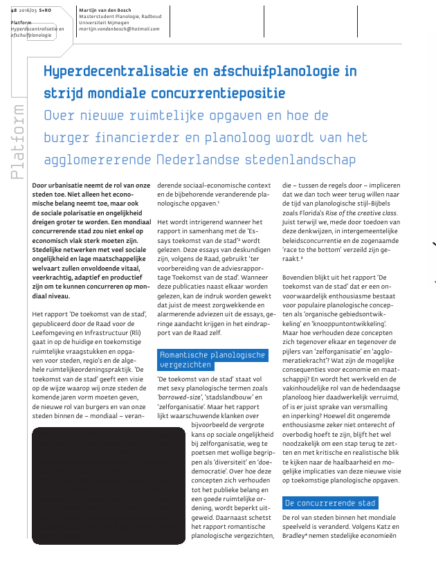 PlatformDoor urbanisatie neemt de rol van onzesteden toe. Niet alleen het econo-mische belang neemt toe, maar ookde sociale polarisatie en ongelijkheiddreigen groter te worden. Een mondiaalconcurrerende stad zou niet enkel opeconomisch vlak sterk moeten zijn.Stedelijke netwerken met veel socialeongelijkheid en lage maatschappelijkewelvaart zullen onvoldoende vitaal,veerkrachtig, adaptief en productiefzijn om te kunnen concurreren op mon-diaal niveau.Het rapport `De toekomst van de stad',gepubliceerd door de Raad voor deLeefomgeving en Infrastructuur (Rli)gaat in op de huidige en toekomstigeruimtelijke vraagstukken en opga-ven voor steden, regio's en de alge-hele ruimtelijkeordeningspraktijk. `Detoekomst van de stad' geeft een visieop de wijze waarop wij onze steden dekomende jaren vorm moeten geven,de nieuwe rol van burgers en van onzesteden binnen de ? mondiaal ? veran-derende sociaal-economische contexten de bijbehorende veranderende pla-nologische opgaven.1Het wordt intrigerend wanneer hetrapport in samenhang met de `Es-says toekomst van de stad'2 wordtgelezen. Deze essays van deskundigenzijn, volgens de Raad, gebruikt `tervoorbereiding van de adviesrappor-tage Toekomst van de stad'. Wanneerdeze publicaties naast elkaar wordengelezen, kan de indruk worden gewektdat juist de meest zorgwekkende enalarmerende adviezen uit de essays, ge-ringe aandacht krijgen in het eindrap-port van de Raad zelf.Romantische planologischevergezichten`De toekomst van de stad' staat volmet sexy planologische termen zoals`borrowed-size', `stadslandbouw' en`zelforganisatie'. Maar het rapportlijkt waarschuwende klanken overdie ? tussen de regels door ? implicerendat we dan toch weer terug willen naarde tijd van planologische stijl-Bijbelszoals Florida's Rise of the creative class.Juist terwijl we, mede door toedoen vandeze denkwijzen, in intergemeentelijkebeleidsconcurrentie en de zogenaamde`race to the bottom' verzeild zijn ge-raakt.3Bovendien blijkt uit het rapport `Detoekomst van de stad' dat er een on-voorwaardelijk enthousiasme bestaatvoor populaire planologische concep-ten als `organische gebiedsontwik-keling' en `knooppuntontwikkeling'.Maar hoe verhouden deze conceptenzich tegenover elkaar en tegenover depijlers van `zelforganisatie' en `agglo-meratiekracht'? Wat zijn de mogelijkeconsequenties voor economie en maat-schappij? En wordt het werkveld en devakinhoudelijke rol van de hedendaagseplanoloog hier daadwerkelijk verruimd,of is er juist sprake van versmallingen inperking? Hoewel dit ongeremdeenthousiasme zeker niet onterecht ofoverbodig hoeft te zijn, blijft het welnoodzakelijk om een stap terug te zet-ten en met kritische en realistische blikte kijken naar de haalbaarheid en mo-gelijke implicaties van deze nieuwe visieop toekomstige planologische opgaven.De concurrerende stadDe rol van steden binnen het mondialespeelveld is veranderd. Volgens Katz enBradley4 nemen stedelijke economie?nMartijn van den Bosch, winnaar van de JongePlanologenprijs 2016, schreef voor de Plandag2016 het paper `Hyperdecentralisatie enafschuifplanologie in de strijd om mondialeconcurrentiepositie'. Hij wil met dit verhaalhet professionele debat over de toekomstam-bities voor Nederlandse steden, ruimtelijkeopgaven en de toekomstige rol van bestuur-ders en planologen op gang brengen, en neemthet Rli-rapport `De toekomst van de stad' alsuitgangspunt. Dit artikel is een bekorte versievan zijn paper.Hyperdecentralisatie en afschuifplanologie instrijd mondiale concurrentiepositieOver nieuwe ruimtelijke opgaven en hoe deburger financierder en planoloog wordt van hetagglomererende Nederlandse stedenlandschapbijvoorbeeld de vergrotekans op sociale ongelijkheidbij zelforganisatie, weg tepoetsen met wollige begrip-pen als `diversiteit' en `doe-democratie'. Over hoe dezeconcepten zich verhoudentot het publieke belang eneen goede ruimtelijke or-dening, wordt beperkt uit-geweid. Daarnaast schetsthet rapport romantischeplanologische vergezichten,48 2016/03 S+ROPlatformHyperdecentralisatie enafschuifplanologieMartijn van den BoschMasterstudent Planologie, RadboudUniversiteit Nijmegenmartijn.vandenbosch@hotmail.comPlatformpbl.nlLisbon (529,000)Madrid (1,409,000)Paris (1,857,000)London (1,094,000)Berlin (817,000)Athens (1,247,000)Warsaw (644,000)Bucharest (915,000)Rome (707,000)Budapest (557,000)Milan (728,000)steeds meer de plek in van staten, alsconcurrerende eenheden binnen demondiale economie. Agglomeratie-voordelen zorgen ervoor dat juist dezestedelijke netwerken over voldoendeeconomische kracht beschikken, om opmondiaal niveau van betekenis te zijn.Vanwege de polycentrische structuurvan stedelijk Nederland, ontbreekt hetvolgens de Rli aan voldoende massa endichtheid van Nederlandse steden. Ommee te kunnen concurreren op mondi-aal niveau, wordt daarom gepleit vooreen beter `stedelijk verdienvermogen'en daarmee voor betere verbindingentussen steden. En daarnaast een focusop het benutten van elkaars krachten? `complementariteit' ? om zo de dicht-heid en massa van stedelijke netwerkente vergroten. Deze doelen moeten medeworden bereikt door de bestaande be-bouwde omgeving te herstructurerenen beter te benutten. En daarnaast tezorgen voor betere regionale afstem-ming, samenwerking en het verbeterenvan de infrastructuur tussen steden? waaronder transport, water en data.Deze stellingen worden breed onder-steund in de planningsliteratuur.5Het belang van de steden neemt vol-gens de Rli toe, doordat het overgrotedeel van de Nederlandse bevolking instedelijke gebieden woont. Bovendienleeft ruim de helft van de bevolkingbinnen de OESO-landen in stedelijkegebieden en dit aandeel zal naar ver-wachting nog sterk groeien.6 Door detoenemende globalisering van econo-mie?n werd voorspeld, dat het percen-tage inwoners en bedrijven in stedelijkeregio's zou dalen door de toegenomenconnectiviteit. Niets blijkt minder waar.Het economische belang van stedenneemt toe door grotere productiviteiten economische groei binnen stedelijkenetwerken. Vanwege agglomeratie-