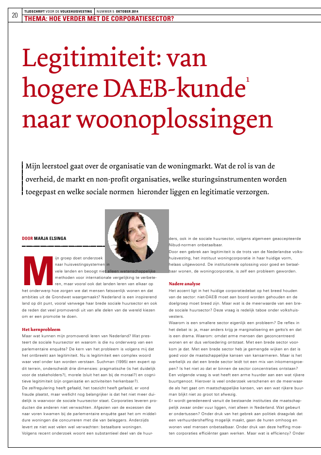 20TIJDSCHRIFT VOOR DE VOLKSHUISVESTING NUMMER 5 OKTOBER 2014DOOR MARJA ELSINGAMijn groep doet onderzoeknaar huisvestingsystemen invele landen en beoogt niet alleen wetenschappelijkemethoden voor internationale vergelijking te verbete-ren, maar vooral ook dat landen leren van elkaar ophet onderwerp hoe zorgen we dat mensen fatsoenlijk wonen en datambities uit de Grondwet waargemaakt? Nederland is een inspirerendland op dit punt, vooral vanwege haar brede sociale huursector en ookde reden dat veel promovendi uit van alle delen van de wereld kiezenom er een promotie te doen.Het kernprobleemMaar wat kunnen mijn promovendi leren van Nederland? Wat pres-teert de sociale huursector en waarom is die nu onderwerp van eenparlementaire enqu?te? De kern van het probleem is volgens mij dathet ontbreekt aan legitimiteit. Nu is legitimiteit een complex woordwaar veel onder kan worden verstaan. Suchman (1995) een expert opdit terrein, onderscheidt drie dimensies: pragmatische (is het duidelijkvoor de stakeholders?), morele (sluit het aan bij de moraal?) en cogni-tieve legitimiteit (zijn organisatie en activiteiten herkenbaar?).De zelfregulering heeft gefaald, het toezicht heeft gefaald, er vondfraude plaatst, maar wellicht nog belangrijker is dat het niet meer dui-delijk is waarvoor de sociale huursector staat. Corporaties leveren pro-ducten die anderen niet verwachten. Afgezien van de excessen dienaar voren kwamen bij de parlementaire enqu?te gaat het om middel-dure woningen die concurreren met die van beleggers. Anderzijdslevert ze niet wat velen wel verwachten: betaalbare woningen.Volgens recent onderzoek woont een substantieel deel van de huur-ders, ook in de sociale huursector, volgens algemeen geaccepteerdeNibud-normen onbetaalbaar.Door een gebrek aan legitimiteit is de trots van de Nederlandse volks-huisvesting, het instituut woningcorporatie in haar huidige vorm,helaas uitgewoond. De institutionele oplossing voor goed en betaal-baar wonen, de woningcorporatie, is zelf een probleem geworden.Nadere analyseHet accent ligt in het huidige corporatiedebat op het breed houdenvan de sector: niet-DAEB moet aan boord worden gehouden en dedoelgroep moet breed zijn. Maar wat is de meerwaarde van een bre-de sociale huursector? Deze vraag is redelijk taboe onder volkshuis-vesters.Waarom is een smallere sector eigenlijk een probleem? De reflex inhet debat is: ja, maar anders krijg je marginalisering en getto's en datis een drama. Waarom: omdat arme mensen dan geconcentreerdwonen en er dus verloedering ontstaat. Met een brede sector voor-kom je dat. Met een brede sector heb je gemengde wijken en dat isgoed voor de maatschappelijke kansen van kansarmeren. Maar is hetwerkelijk zo dat een brede sector leidt tot een mix van inkomensgroe-pen? Is het niet zo dat er binnen de sector concentraties ontstaan?Een volgende vraag is wat heeft een arme huurder aan een wat rijkerebuurtgenoot. Hierover is veel onderzoek verschenen en de meerwaar-de als het gaat om maatschappelijke kansen, van een wat rijkere buur-man blijkt niet zo groot tot afwezig.Er wordt geredeneerd vanuit de bestaande instituties die maatschap-pelijk zwaar onder vuur liggen, niet alleen in Nederland. Wat gebeurter ondertussen? Onder druk van het gebrek aan politiek draagvlak dateen verhuurdersheffing mogelijk maakt, gaan de huren omhoog enwonen veel mensen onbetaalbaar. Onder druk van deze heffing moe-ten corporaties effici?nter gaan werken. Maar wat is efficiency? OnderLegitimiteit: vanhogere DAEB-kunde1naar woonoplossingenMijn leerstoel gaat over de organisatie van de woningmarkt. Wat de rol is van deoverheid, de markt en non-profit organisaties, welke sturingsinstrumenten wordentoegepast en welke sociale normen hieronder liggen en legitimatie verzorgen.THEMA: HOE VERDER MET DE CORPORATIESECTOR?21TIJDSCHRIFT VOOR DE VOLKSHUISVESTING NUMMER 5 OKTOBER 2014druk van de heffing wordt er volop geschrapt in de uitgaven. Maar inwelke uitgaven en lijdt niet ook de service aan de huurder daaronder?Lijdt de leefbaarheid niet daaronder? Gaat het niet om zaken dieeigenlijk tot de kerntaak behoren? Die vraag is moeilijk te beantwoor-den, omdat niet helder is wat de kerntaak is van woningcorporaties.Wat verstaan we anno 2014 eigenlijk onder `het belang van de volks-huisvesting'?OplossingsrichtingMoeten we niet denken in termen van maatschappelijke efficiency inplaats van alleen bedrijfseconomische? Wat wint de maatschappij metoverheidsbemoeienis op de woningmarkt? Wat is publiek belang enwelke kosten worden bespaard met het dienen van dit belang? Watkost een dakloze, wat kost een buurt waar niemand meer wil wonen?Onderzoek ontbreekt hier helaas. Er is een instituut, de woningcorpo-ratie, dat problemen pretendeert aan te pakken. De oplossing woning-corporatie sluit echter niet aan bij de problemen en het politieke dis-cours in 2014.Mensen en huizenWoningcorporaties hebben goed gewerkt: de woningmarkt staat ergoed voor, maar het instituut woningcorporatie is uitgewoond. Wemoeten toe naar institutionele vernieuwing, want adequaat wonenblijft verankerd in de Grondwet en heeft ook maatschappelijke meer-waarde ofwel dient een publiek belang. We moeten voortbouwen opde huidige situatie, die is nog steeds redelijk en staat dus ook niet opde politieke agenda. Minister Blok heeft veel steun voor zijn beleid omde sector te laten krimpen en gaat ook bijzonder voortvarend te werk.Een visie op hoe te zorgen voor de in de Grondwet verankerde ambi-tie om fatsoenlijke huisvesting te realiseren ontbreekt helaas. Wemoeten terug naar mensen en huizen.Inhoud opnieuw verpakken in toekomstbestendige institutiesMoeten we dan de sector laten krimpen zodat er kans is op marginali-sering, op getto's? Nou, we kunnen daar op zijn minst over nadenken.Wat is er eigenlijk mis met een goed sociaal vangnet? De kunst wordtdan: wees creatief in het bouwen van betaalbare woningen: qua ont-werp en bijdragen van bewoners in het ontwerpproces is er veel teweinig creativiteit als je het mij vraagt. Met ontwe
