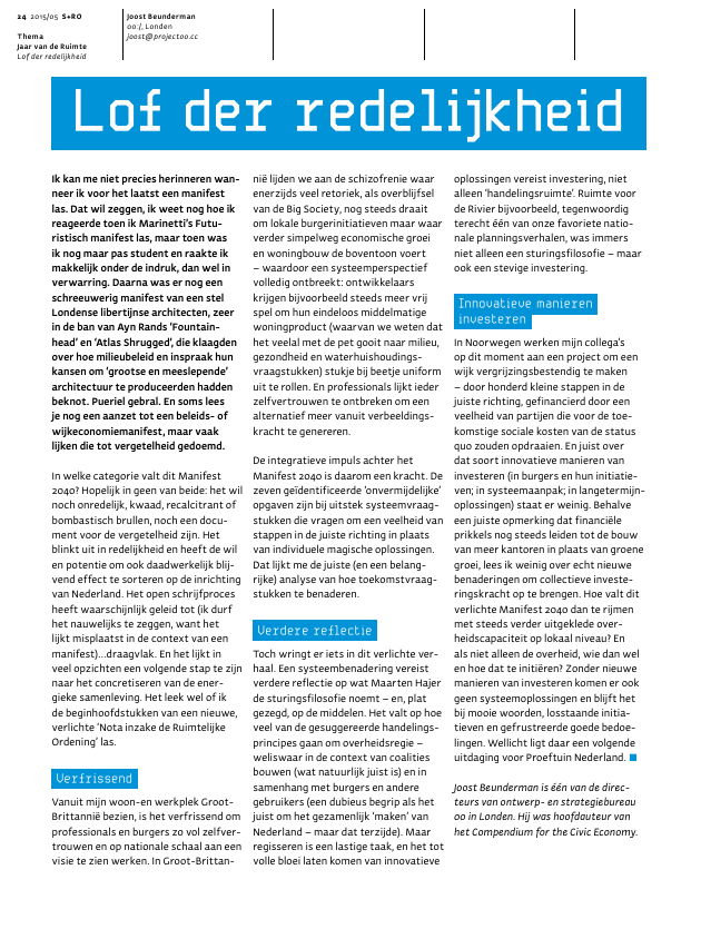 Joost Beunderman00:/, Londenjoost@project00.cc24 2015/05 S+ROThemaJaar van de RuimteLof der redelijkheidIk kan me niet precies herinneren wan-neer ik voor het laatst een manifestlas. Dat wil zeggen, ik weet nog hoe ikreageerde toen ik Marinetti's Futu-ristisch manifest las, maar toen wasik nog maar pas student en raakte ikmakkelijk onder de indruk, dan wel inverwarring. Daarna was er nog eenschreeuwerig manifest van een stelLondense libertijnse architecten, zeerin de ban van Ayn Rands `Fountain-head' en `Atlas Shrugged', die klaagdenover hoe milieubeleid en inspraak hunkansen om `grootse en meeslepende'architectuur te produceerden haddenbeknot. Pueriel gebral. En soms leesje nog een aanzet tot een beleids- ofwijkeconomiemanifest, maar vaaklijken die tot vergetelheid gedoemd.In welke categorie valt dit Manifest2040? Hopelijk in geen van beide: het wilnoch onredelijk, kwaad, recalcitrant ofbombastisch brullen, noch een docu-ment voor de vergetelheid zijn. Hetblinkt uit in redelijkheid en heeft de wilen potentie om ook daadwerkelijk blij-vend effect te sorteren op de inrichtingvan Nederland. Het open schrijfprocesheeft waarschijnlijk geleid tot (ik durfhet nauwelijks te zeggen, want hetlijkt misplaatst in de context van eenmanifest)...draagvlak. En het lijkt inveel opzichten een volgende stap te zijnnaar het concretiseren van de ener-gieke samenleving. Het leek wel of ikde beginhoofdstukken van een nieuwe,verlichte `Nota inzake de RuimtelijkeOrdening' las.VerfrissendVanuit mijn woon-en werkplek Groot-Brittanni? bezien, is het verfrissend omprofessionals en burgers zo vol zelfver-trouwen en op nationale schaal aan eenvisie te zien werken. In Groot-Brittan-ni? lijden we aan de schizofrenie waarenerzijds veel retoriek, als overblijfselvan de Big Society, nog steeds draaitom lokale burgerinitiatieven maar waarverder simpelweg economische groeien woningbouw de boventoon voert? waardoor een systeemperspectiefvolledig ontbreekt: ontwikkelaarskrijgen bijvoorbeeld steeds meer vrijspel om hun eindeloos middelmatigewoningproduct (waarvan we weten dathet veelal met de pet gooit naar milieu,gezondheid en waterhuishoudings-vraagstukken) stukje bij beetje uniformuit te rollen. En professionals lijkt iederzelfvertrouwen te ontbreken om eenalternatief meer vanuit verbeeldings-kracht te genereren.De integratieve impuls achter hetManifest 2040 is daarom een kracht. Dezeven ge?dentificeerde `onvermijdelijke'opgaven zijn bij uitstek systeemvraag-stukken die vragen om een veelheid vanstappen in de juiste richting in plaatsvan individuele magische oplossingen.Dat lijkt me de juiste (en een belang-rijke) analyse van hoe toekomstvraag-stukken te benaderen.Verdere reflectieToch wringt er iets in dit verlichte ver-haal. Een systeembenadering vereistverdere reflectie op wat Maarten Hajerde sturingsfilosofie noemt ? en, platgezegd, op de middelen. Het valt op hoeveel van de gesuggereerde handelings-principes gaan om overheidsregie ?weliswaar in de context van coalitiesbouwen (wat natuurlijk juist is) en insamenhang met burgers en anderegebruikers (een dubieus begrip als hetjuist om het gezamenlijk `maken' vanNederland ? maar dat terzijde). Maarregisseren is een lastige taak, en het totvolle bloei laten komen van innovatieveoplossingen vereist investering, nietalleen `handelingsruimte'. Ruimte voorde Rivier bijvoorbeeld, tegenwoordigterecht ??n van onze favoriete natio-nale planningsverhalen, was immersniet alleen een sturingsfilosofie ? maarook een stevige investering.Innovatieve maniereninvesterenIn Noorwegen werken mijn collega'sop dit moment aan een project om eenwijk vergrijzingsbestendig te maken? door honderd kleine stappen in dejuiste richting, gefinancierd door eenveelheid van partijen die voor de toe-komstige sociale kosten van de statusquo zouden opdraaien. En juist overdat soort innovatieve manieren vaninvesteren (in burgers en hun initiatie-ven; in systeemaanpak; in langetermijn-oplossingen) staat er weinig. Behalveeen juiste opmerking dat financi?leprikkels nog steeds leiden tot de bouwvan meer kantoren in plaats van groenegroei, lees ik weinig over echt nieuwebenaderingen om collectieve investe-ringskracht op te brengen. Hoe valt ditverlichte Manifest 2040 dan te rijmenmet steeds verder uitgeklede over-heidscapaciteit op lokaal niveau? Enals niet alleen de overheid, wie dan welen hoe dat te initi?ren? Zonder nieuwemanieren van investeren komen er ookgeen systeemoplossingen en blijft hetbij mooie woorden, losstaande initia-tieven en gefrustreerde goede bedoe-lingen. Wellicht ligt daar een volgendeuitdaging voor Proeftuin Nederland. Joost Beunderman is ??n van de direc-teurs van ontwerp- en strategiebureau00 in Londen. Hij was hoofdauteur vanhet Compendium for the Civic Economy.Lof der redelijkheid