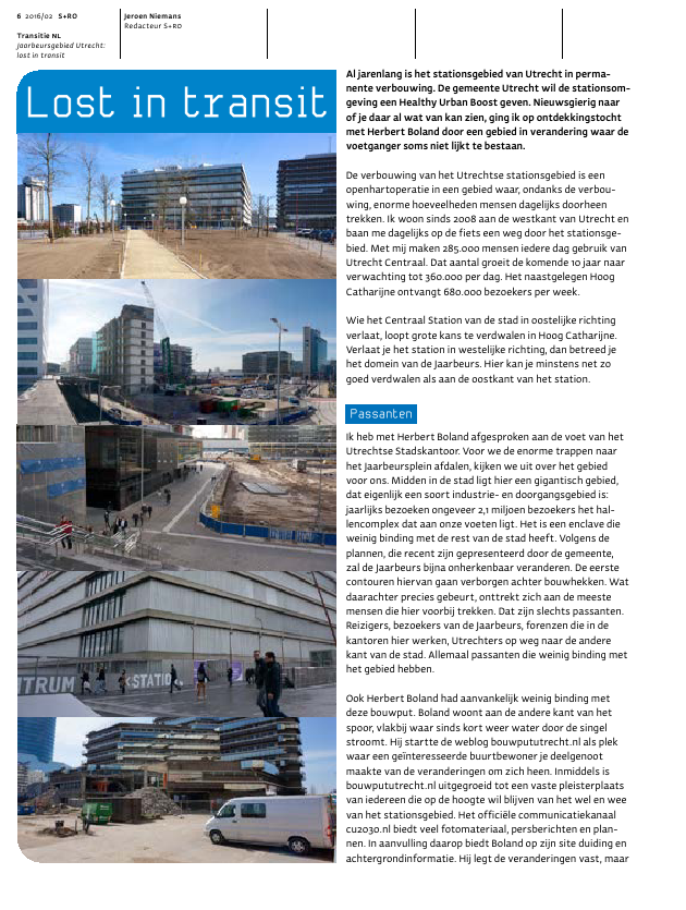 6 2016/02 S+ROTransitie NLJaarbeursgebied Utrecht:lost in transitJeroen NiemansRedacteur S+ROAl jarenlang is het stationsgebied van Utrecht in perma-nente verbouwing. De gemeente Utrecht wil de stationsom-geving een Healthy Urban Boost geven. Nieuwsgierig naarof je daar al wat van kan zien, ging ik op ontdekkingstochtmet Herbert Boland door een gebied in verandering waar devoetganger soms niet lijkt te bestaan.De verbouwing van het Utrechtse stationsgebied is eenopenhartoperatie in een gebied waar, ondanks de verbou-wing, enorme hoeveelheden mensen dagelijks doorheentrekken. Ik woon sinds 2008 aan de westkant van Utrecht enbaan me dagelijks op de fiets een weg door het stationsge-bied. Met mij maken 285.000 mensen iedere dag gebruik vanUtrecht Centraal. Dat aantal groeit de komende 10 jaar naarverwachting tot 360.000 per dag. Het naastgelegen HoogCatharijne ontvangt 680.000 bezoekers per week.Wie het Centraal Station van de stad in oostelijke richtingverlaat, loopt grote kans te verdwalen in Hoog Catharijne.Verlaat je het station in westelijke richting, dan betreed jehet domein van de Jaarbeurs. Hier kan je minstens net zogoed verdwalen als aan de oostkant van het station.PassantenIk heb met Herbert Boland afgesproken aan de voet van hetUtrechtse Stadskantoor. Voor we de enorme trappen naarhet Jaarbeursplein afdalen, kijken we uit over het gebiedvoor ons. Midden in de stad ligt hier een gigantisch gebied,dat eigenlijk een soort industrie- en doorgangsgebied is:jaarlijks bezoeken ongeveer 2,1 miljoen bezoekers het hal-lencomplex dat aan onze voeten ligt. Het is een enclave dieweinig binding met de rest van de stad heeft. Volgens deplannen, die recent zijn gepresenteerd door de gemeente,zal de Jaarbeurs bijna onherkenbaar veranderen. De eerstecontouren hiervan gaan verborgen achter bouwhekken. Watdaarachter precies gebeurt, onttrekt zich aan de meestemensen die hier voorbij trekken. Dat zijn slechts passanten.Reizigers, bezoekers van de Jaarbeurs, forenzen die in dekantoren hier werken, Utrechters op weg naar de anderekant van de stad. Allemaal passanten die weinig binding methet gebied hebben.Ook Herbert Boland had aanvankelijk weinig binding metdeze bouwput. Boland woont aan de andere kant van hetspoor, vlakbij waar sinds kort weer water door de singelstroomt. Hij startte de weblog bouwpututrecht.nl als plekwaar een ge?nteresseerde buurtbewoner je deelgenootmaakte van de veranderingen om zich heen. Inmiddels isbouwpututrecht.nl uitgegroeid tot een vaste pleisterplaatsvan iedereen die op de hoogte wil blijven van het wel en weevan het stationsgebied. Het offici?le communicatiekanaalcu2030.nl biedt veel fotomateriaal, persberichten en plan-nen. In aanvulling daarop biedt Boland op zijn site duiding enachtergrondinformatie. Hij legt de veranderingen vast, maarLost in transitS+RO 2016/02 7Transitie NLJaarbeursgebied Utrecht:lost in transitJaarbeursgebied Utrecht. De foto's bijdit artikel zijn van Herbert Bolandduikt bijvoorbeeld ook in raadstukken en de notulen vande welstandscommissie. De 500 tot 600 bezoekers nemendagelijks een kijkje op de site van deze kritische volger. Ikdenk dat bijna niemand zo goed is ingevoerd als Boland, maartoch komt ook hij tijdens onze wandeling voor verrassingente staan.Plotseling park`Ik ben echt flabbergasted,' roept Herbert uit als we richtingde ingang van het Jaarbeurscomplex wandelen. `Er ligt hieropeens een parkje. Ik wist dat ze hier mee bezig waren, maarhet is stilletjes opeens geopend.' Het kenmerkt de gang vanzaken tijdens de verbouwing van het Utrechtse stationsge-bied: rondom sommige projecten binnen de grootschaligeopknapbeurt van het gebied is er volop media-aandacht.Zoals het water dat terugkeerde in de singel (`Het enige pro-ject dat de gemiddelde Utrechter emotioneel echt iets doet,'aldus Boland) of de opening van TivoliVredenburg.De ontwikkelingen aan de andere kant van het spoor vindenveel meer plaats in de luwte. Hier kan dus door de Jaarbeurszomaar opeens een parkje worden geopend, zonder datvolgers van het gebied, zoals Boland, er erg in hebben. `Letop mijn woorden, over een paar weken, als het lenteweer hettoelaat, dan gaat dit parkje druk gebruikt worden,' voorspeltBoland als ik hem vraag naar wat je op deze plek nu met eenparkje moet. `In de wijde omtrek is geen openbaar groen,dus ik verwacht dat veel mensen er gebruik van zullen gaanmaken.'NatuurverschijnselWe wandelen verder het terrein van de Jaarbeurs op. Wegluren stiekem tussen de bouwhekken door en zien dat denieuwe megabioscoop, die hier gaat komen, langzaam begintte groeien. We doorkruisen het gigantische parkeerterrein,waar over een paar jaar woningen moeten staan. Je kan je ernog niet zo veel bij voorstellen. Een stukje verder komen weallerlei hekken tegen. Mogen we hier eigenlijk wel lopen? Ditis het expeditiegebied van de Jaarbeurs: hier rijden vracht-wagens zo de gigantische hallen binnen. Aan de andere kantvan de weg staat, verscholen in het groen, het Huis vanMien: een voormalige hovenierswoning die al sinds 1996wordt bedreigd met sloop. Het is het laatste pand dat res-teert van de oorspronkelijke bebouwing in dit gebied, waarveel boerderijen en tuinderswoningen stonden. Na jarenactievoeren lijkt het nu te lukken om het huis te behouden.Het is voor Boland een van de symbolen van het verzet tegende grootschalige plannen in dit gebied. `Ook bij de acties voorhet behoud van bestaande bebouwing aan de van Sijpe-steijnkade, een van de laatste rijtjes bebouwing die in dejaren 1970 aan grootschalige sloop is ontkomen, proefde jenog wat van de activistische sfeer uit die jaren.'`Bijsturing van de plannen op menselijke, individuele schaal,de schaal van de Utrechter, die zie je amper. De herontwikke-ling van het stationsgebied is een soort natuurverschijnsel:een autonoom proces dat maar doordendert en dat niemandecht lijkt te kunnen bijsturen. Alleen aan de randen van hetgebied lijkt het burgers te lukken hier de plannen bij te stu-ren door zelf initiatief te nemen.' Naast het Huis