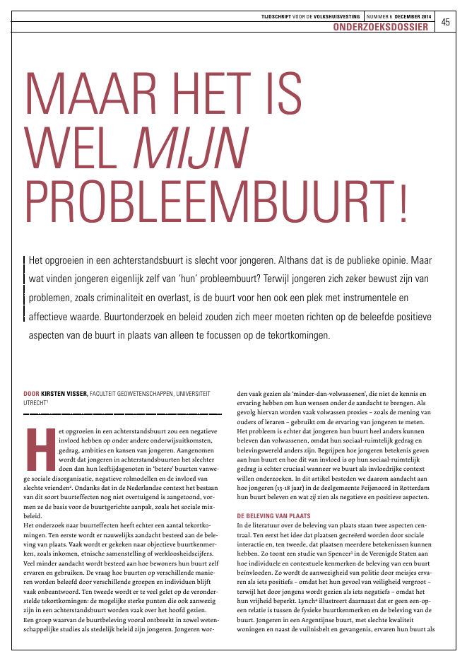 45TIJDSCHRIFT VOOR DE VOLKSHUISVESTING NUMMER 6 DECEMBER 2014ONDERZOEKSDOSSIERDOOR KIRSTEN VISSER, FACULTEIT GEOWETENSCHAPPEN, UNIVERSITEITUTRECHT1Het opgroeien in een achterstandsbuurt zou een negatieveinvloed hebben op onder andere onderwijsuitkomsten,gedrag, ambities en kansen van jongeren. Aangenomenwordt dat jongeren in achterstandsbuurten het slechterdoen dan hun leeftijdsgenoten in `betere' buurten vanwe-ge sociale disorganisatie, negatieve rolmodellen en de invloed vanslechte vrienden2. Ondanks dat in de Nederlandse context het bestaanvan dit soort buurteffecten nog niet overtuigend is aangetoond, vor-men ze de basis voor de buurtgerichte aanpak, zoals het sociale mix-beleid.Het onderzoek naar buurteffecten heeft echter een aantal tekortko-mingen. Ten eerste wordt er nauwelijks aandacht besteed aan de bele-ving van plaats. Vaak wordt er gekeken naar objectieve buurtkenmer-ken, zoals inkomen, etnische samenstelling of werkloosheidscijfers.Veel minder aandacht wordt besteed aan hoe bewoners hun buurt zelfervaren en gebruiken. De vraag hoe buurten op verschillende manie-ren worden beleefd door verschillende groepen en individuen blijftvaak onbeantwoord. Ten tweede wordt er te veel gelet op de veronder-stelde tekortkomingen: de mogelijke sterke punten die ook aanwezigzijn in een achterstandsbuurt worden vaak over het hoofd gezien.Een groep waarvan de buurtbeleving vooral ontbreekt in zowel weten-schappelijke studies als stedelijk beleid zijn jongeren. Jongeren wor-den vaak gezien als `minder-dan-volwassenen', die niet de kennis enervaring hebben om hun wensen onder de aandacht te brengen. Alsgevolg hiervan worden vaak volwassen proxies ? zoals de mening vanouders of leraren ? gebruikt om de ervaring van jongeren te meten.Het probleem is echter dat jongeren hun buurt heel anders kunnenbeleven dan volwassenen, omdat hun sociaal-ruimtelijk gedrag enbelevingswereld anders zijn. Begrijpen hoe jongeren betekenis gevenaan hun buurt en hoe dit van invloed is op hun sociaal-ruimtelijkgedrag is echter cruciaal wanneer we buurt als invloedrijke contextwillen onderzoeken. In dit artikel besteden we daarom aandacht aanhoe jongeren (13-18 jaar) in de deelgemeente Feijenoord in Rotterdamhun buurt beleven en wat zij zien als negatieve en positieve aspecten.DE BELEVING VAN PLAATSIn de literatuur over de beleving van plaats staan twee aspecten cen-traal. Ten eerst het idee dat plaatsen gecre?erd worden door socialeinteractie en, ten tweede, dat plaatsen meerdere betekenissen kunnenhebben. Zo toont een studie van Spencer3in de Verenigde Staten aanhoe individuele en contextuele kenmerken de beleving van een buurtbe?nvloeden. Zo wordt de aanwezigheid van politie door meisjes erva-ren als iets positiefs ? omdat het hun gevoel van veiligheid vergroot ?terwijl het door jongens wordt gezien als iets negatiefs ? omdat hethun vrijheid beperkt. Lynch4illustreert daarnaast dat er geen een-op-een relatie is tussen de fysieke buurtkenmerken en de beleving van debuurt. Jongeren in een Argentijnse buurt, met slechte kwaliteitwoningen en naast de vuilnisbelt en gevangenis, ervaren hun buurt alsMAAR HET ISWEL MIJNPROBLEEMBUURT!Het opgroeien in een achterstandsbuurt is slecht voor jongeren. Althans dat is de publieke opinie. Maarwat vinden jongeren eigenlijk zelf van `hun' probleembuurt? Terwijl jongeren zich zeker bewust zijn vanproblemen, zoals criminaliteit en overlast, is de buurt voor hen ook een plek met instrumentele enaffectieve waarde. Buurtonderzoek en beleid zouden zich meer moeten richten op de beleefde positieveaspecten van de buurt in plaats van alleen te focussen op de tekortkomingen.46TIJDSCHRIFT VOOR DE VOLKSHUISVESTING NUMMER 6 DECEMBER 2014ONDERZOEKSDOSSIERfijn, beschermd en vriendelijk. Ze voelen zich er veilig en thuis.Ondanks deze bevindingen wordt er in veel buurteffectonderzoek noguitgegaan van zogeheten `deficit modellen' die veronderstellen datsociaal-economische achterstand per definitie samen gaat met eengebrek aan sociaal kapitaal en sociale cohesie en afwijkende normenen waarden. In reactie hierop introduceren Aber en Nieto5de zogehe-ten `pluralistische' buurttheorie, die ervan uit gaat dat zelfs in debuurten met de meeste sociaal-economische achterstand er sprake kanzijn van positieve processen.Een belangrijk concept in deze context is emotionele binding met eenplaats. Deze plaatsbinding kan refereren naar zowel de fysieke plaatsals de gemeenschap die aanwezig is op deze plaats en daarmee helpt deidentiteit van die plaats te defini?ren. Twigger-Ross en Uzzell6verbin-den plaatsbinding aan identiteitsvorming. Personen voelen zich ver-bonden met een bepaalde plaats als deze voorziet in ten minste ??nvan de volgende vier menselijke behoeften: onderscheidingsvermo-gen, continu?teit, eigenwaarde en zelfredzaamheid (zie box 1).Onderscheidingsvermogen: personen gebruiken plaatsen omzich te onderscheiden van anderen, zoals mensen in een anderestad (een Rotterdammer zijn) of een andere wijk (uit Rotterdam-Zuid komen)Continuiteit: plaatsen kunnen refereren naar eerdere gebeurte-nissen en ervaringen. Dit leidt tot een gevoel van continuiteit.Eigenwaarde: personen voelen zich verbonden met een bepaal-de plaats wanneer dit leidt tot meer eigenwaarde of socialewaardeZelfredzaamheid: personen voelen zich verbonden met eenplek wanneer ze in staat zijn daar de dingen te doen die ze graagwillen doenIs er ook een verschil tussen buurtbinding in achterstandsbuurten en`betere' buurten? Het gevoel van eigenwaarde en zelfredzaamheid zouwel eens lager kunnen zijn in achterstandsbuurten, vanwege respec-tievelijk stigmatisering en onveiligheid. Onderzoek in het VerenigdKoninkrijk7toont aan dat buurtbinding lager is in achterstandsbuur-ten dan in `betere' buurten, vooral vanwege het gebrek aan socialecohesie. Veel onderzoekers stellen dat de etnische samenstelling eenbelangrijke rol speelt voor de sociale cohesie in de buurt. Zo steltPutnam8dat bewoners in etnisch gemengde buurten in de VerenigdeStaten de neiging he