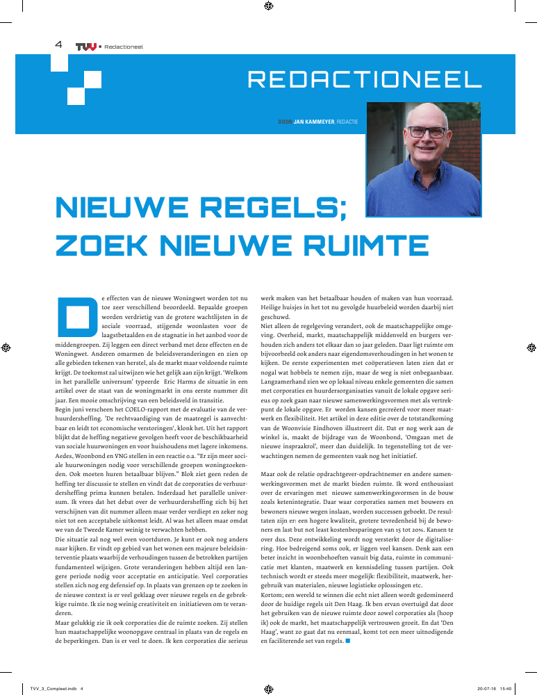 REDACTIONEEL4 ? RedactioneelDe effecten van de nieuwe Woningwet worden tot nutoe zeer verschillend beoordeeld. Bepaalde groepenworden verdrietig van de grotere wachtlijsten in desociale voorraad, stijgende woonlasten voor delaagstbetaalden en de stagnatie in het aanbod voor demiddengroepen. Zij leggen een direct verband met deze effecten en deWoningwet. Anderen omarmen de beleidsveranderingen en zien opalle gebieden tekenen van herstel, als de markt maar voldoende ruimtekrijgt. De toekomst zal uitwijzen wie het gelijk aan zijn krijgt. `Welkomin het parallelle universum' typeerde Eric Harms de situatie in eenartikel over de staat van de woningmarkt in ons eerste nummer ditjaar. Een mooie omschrijving van een beleidsveld in transitie.Begin juni verscheen het COELO-rapport met de evaluatie van de ver-huurdersheffing. 'De rechtvaardiging van de maatregel is aanvecht-baar en leidt tot economische verstoringen`, klonk het. Uit het rapportblijkt dat de heffing negatieve gevolgen heeft voor de beschikbaarheidvan sociale huurwoningen en voor huishoudens met lagere inkomens.Aedes, Woonbond en VNG stellen in een reactie o.a. "Er zijn meer soci-ale huurwoningen nodig voor verschillende groepen woningzoeken-den. Ook moeten huren betaalbaar blijven." Blok ziet geen reden deheffing ter discussie te stellen en vindt dat de corporaties de verhuur-dersheffing prima kunnen betalen. Inderdaad het parallelle univer-sum. Ik vrees dat het debat over de verhuurdersheffing zich bij hetverschijnen van dit nummer alleen maar verder verdiept en zeker nogniet tot een acceptabele uitkomst leidt. Al was het alleen maar omdatwe van de Tweede Kamer weinig te verwachten hebben.Die situatie zal nog wel even voortduren. Je kunt er ook nog andersnaar kijken. Er vindt op gebied van het wonen een majeure beleidsin-terventie plaats waarbij de verhoudingen tussen de betrokken partijenfundamenteel wijzigen. Grote veranderingen hebben altijd een lan-gere periode nodig voor acceptatie en anticipatie. Veel corporatiesstellen zich nog erg defensief op. In plaats van grenzen op te zoeken inde nieuwe context is er veel geklaag over nieuwe regels en de gebrek-kige ruimte. Ik zie nog weinig creativiteit en initiatieven om te veran-deren.Maar gelukkig zie ik ook corporaties die de ruimte zoeken. Zij stellenhun maatschappelijke woonopgave centraal in plaats van de regels ende beperkingen. Dan is er veel te doen. Ik ken corporaties die serieuswerk maken van het betaalbaar houden of maken van hun voorraad.Heilige huisjes in het tot nu gevolgde huurbeleid worden daarbij nietgeschuwd.Niet alleen de regelgeving verandert, ook de maatschappelijke omge-ving. Overheid, markt, maatschappelijk middenveld en burgers ver-houden zich anders tot elkaar dan 10 jaar geleden. Daar ligt ruimte ombijvoorbeeld ook anders naar eigendomsverhoudingen in het wonen tekijken. De eerste experimenten met co?peratieven laten zien dat ernogal wat hobbels te nemen zijn, maar de weg is niet onbegaanbaar.Langzamerhand zien we op lokaal niveau enkele gemeenten die samenmet corporaties en huurdersorganisaties vanuit de lokale opgave seri-eus op zoek gaan naar nieuwe samenwerkingsvormen met als vertrek-punt de lokale opgave. Er worden kansen gecre?erd voor meer maat-werk en flexibiliteit. Het artikel in deze editie over de totstandkomingvan de Woonvisie Eindhoven illustreert dit. Dat er nog werk aan dewinkel is, maakt de bijdrage van de Woonbond, `Omgaan met denieuwe inspraakrol', meer dan duidelijk. In tegenstelling tot de ver-wachtingen nemen de gemeenten vaak nog het initiatief.Maar ook de relatie opdrachtgever-opdrachtnemer en andere samen-werkingsvormen met de markt bieden ruimte. Ik word enthousiastover de ervaringen met nieuwe samenwerkingsvormen in de bouwzoals ketenintegratie. Daar waar corporaties samen met bouwers enbewoners nieuwe wegen inslaan, worden successen geboekt. De resul-taten zijn er: een hogere kwaliteit, grotere tevredenheid bij de bewo-ners en last but not least kostenbesparingen van 15 tot 20%. Kansen teover dus. Deze ontwikkeling wordt nog versterkt door de digitalise-ring. Hoe bedreigend soms ook, er liggen veel kansen. Denk aan eenbeter inzicht in woonbehoeften vanuit big data, ruimte in communi-catie met klanten, maatwerk en kennisdeling tussen partijen. Ooktechnisch wordt er steeds meer mogelijk: flexibiliteit, maatwerk, her-gebruik van materialen, nieuwe logistieke oplossingen etc.Kortom; een wereld te winnen die echt niet alleen wordt gedomineerddoor de huidige regels uit Den Haag. Ik ben ervan overtuigd dat doorhet gebruiken van de nieuwe ruimte door zowel corporaties als (hoopik) ook de markt, het maatschappelijk vertrouwen groeit. En dat `DenHaag', want zo gaat dat nu eenmaal, komt tot een meer uitnodigendeen faciliterende set van regels. nNIEUWE REGELS;ZOEK NIEUWE RUIMTEDOOR JAN KAMMEYER, REDACTIETVV_3_Compleet.indb 4 20-07-16 15:40