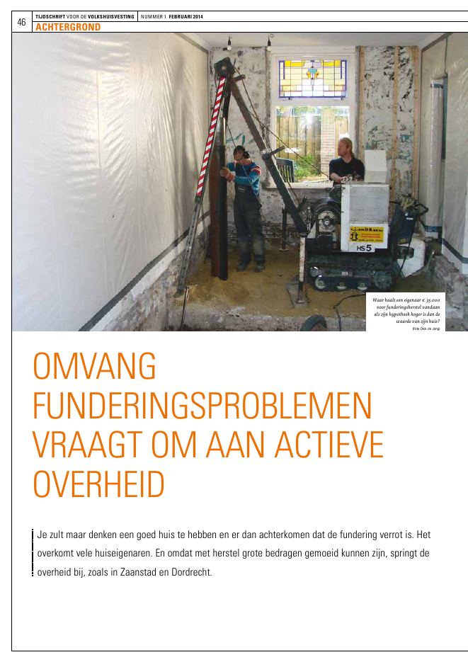 46ACHTERGRONDTIJDSCHRIFT VOOR DE VOLKSHUISVESTING NUMMER 1 FEBRUARI 2014OMVANGFUNDERINGSPROBLEMENVRAAGT OM AAN ACTIEVEOVERHEIDJe zult maar denken een goed huis te hebben en er dan achterkomen dat de fundering verrot is. Hetoverkomt vele huiseigenaren. En omdat met herstel grote bedragen gemoeid kunnen zijn, springt deoverheid bij, zoals in Zaanstad en Dordrecht.Waarhaalteeneigenaar35.000voorfunderingsherstelvandaanalszijnhypotheekhogerisdandewaardevanzijnhuis?(Foto Dick de Jong)47ACHTERGRONDTIJDSCHRIFT VOOR DE VOLKSHUISVESTING NUMMER 1 FEBRUARI 2014DOOR WIM VAN DEN ENGEL, GEMEENTE DORDRECHT, DICK DE JONG,DE GROENE WERF EN BESTUURSLID KCAF, WILLEKE KOOPS, GEMEENTEZAANSTAD, EN FRANK WASSENBERG, PLATFORM31Funderingsherstel is een bijzondere en tevens kostbare vormvan particuliere woningverbetering. Maar ook een noodzake-lijke: het gaat om bouwtechnische veiligheid. Huizen verzak-ken, scheuren en dreigen in elkaar te zakken. In Zaanstad enDordrecht krijgen duizenden woningeigenaren vroeg of laatte maken met de vervanging van de fundering van hun woning.Dergelijke constructieve problemen zijn voor een woningeigenaaraltijd onvoorzien en brengen erg hoge kosten met zich. Beide gemeen-ten hebben na tien jaar stimuleringsbeleid gekozen voor een facilite-rende aanpak, maar blijven wel een rol spelen.In modderig Nederland staan op verschillende plekken woningen meternstige funderingsproblemen, vooral in het westen des lands. Meijerschat dat driekwart miljoen woningen die gefundeerd zijn op houtenpalen, tot de risicogroep behoren. Ongeveer 200.000 tot 250.000woningen hebben een latent of acuut funderingsprobleem. Vaak gaathet om eigen woningen. Slechte funderingen kunnen bij alle soortenhuizen voorkomen, maar in de praktijk liggen de meest knellende pro-blemen bij de onderkant van de woningmarkt. De aandacht en getallenhebben vooral betrekking op de houten palen funderingen: houtrot,houtschimmels, te lage grondwaterstanden, bacteri?n, te weinig of tekorte palen en negatieve kleef. Daarnaast zijn er ook vele woningen dieop staal (d.w.z. op een laag zand) zijn gebouwd, en verzakken.Wie is er eigenlijk aansprakelijk voor een slechte fundering van eenoud huis? De verantwoordelijkheidsvraag is weliswaar belangrijk,maar eigenlijk achterhaald. De Hoge Raad heeft uiteindelijk bepaalddat de dader op het kerkhof ligt: er is niet ??n partij aan te wijzen voorde schuldvraag. De oorzaken van de slechte funderingen kunnen ver-schillen, met verschillende schuldenaren. Uiteindelijk komt het op hetbordje van de huidige eigenaar.Hoewel het om privaat bezit gaat, grijpen gemeenten wel in om rede-nen van verpaupering, leefbaarheid, waardedaling van panden in denabije omgeving, volksgezondheid, veiligheid en vervolgschade aangemeentebezit. Het rijk heeft in het verleden erkend dat gemeentennoch eigenaren de benodigde soms buitensporig hoge uitgaven - 60.000 tot 80.000 of nog meer - alleen konden dragen. In 2001 zegdehet rijk subsidie toe aan zes gemeenten: Dordrecht, Gouda, Haarlem,Waddinxveen, Schiedam en Zaanstad, die, met een verlenging, duurdetot 2010. In 2009 stelde een grotere groep gemeenten een manifest op,naar aanleiding waarvan uiteindelijk het Kenniscentrum AanpakFunderingsproblematiek (KCAF) is opgericht.Grote investeringen leiden hooguit tot waardebehoud ten opzichtevan de oorspronkelijke situatie. Begin 2013 zijn de financieringseisenaangescherpt waardoor het alleen mogelijk is om funderingshersteluit te laten voeren met de overwaarde van de woning of met eigengeld. En dit blijkt steeds minder vaak aanwezig. Dit leidt ertoe dat erper bouwblok dikwijls wel een of meerdere eigenaren zijn die funde-ringsherstel niet kunnen betalen, waardoor herstel van het gehele blokstagneert.De Tweede Kamer heeft in een motie medio 2013 de minister gevraagdom in overleg met het KCAF tot aanvullende voorstellen te komen omde stagnatie te verhelpen en een verdere aanpak te bevorderen. Ditoverleg heeft geresulteerd in een aantal voorstellen die eind januariaan de minister worden aangeboden, ter behandeling in de Kamer.Naar schatting van onderzoeksbureau Deltares (2012) zal de totalebenodigde investering bij de woningen op houten palen, wanneer erniet snel iets gebeurt, kunnen oplopen tot zo'n 40 miljard euro in dekomende 25 jaar. En dan spreken we alleen nog maar over technischekosten, en niet over bijkomende kosten.FUNDERINGSAANPAK IN ZAANSTADZaanstad is een van de gemeenten die zich sinds 2001 inzet voor fun-deringsherstel. Als gevolg van de slappe veenbodem en een bacteriedie de hier veel gebruikte grenenhouten palen aantast, zijn veel buur-ten kwetsbaar voor verzakkingen. Zaanstad heeft 9.000 vooroorlogseparticuliere woningen en mogelijk nog eens 7.000 naoorlogse wonin-gen die kampen met een slechte fundering. Vaak gaat het om kleine,gehorige en slecht ge?soleerde woningen in oude wijken, gemengdmet corporatiebezit dat ook aan verbetering toe is. Een bouwtech-nisch, financieel en ook maatschappelijk probleem. Eigenaren wor-den, vaak plotseling, geconfronteerd met uitgaven van vele tiendui-zenden euro's voor een vorm van herstel die eigenlijk niet leidt totzichtbare verbeteringen en de woning enkel terugbrengt op `normaal'niveau. Het is te zien als een probleem van de individuele eigenaar.Een deel van de eigenaren redt het inderdaad op eigen kracht, maar erzijn ook eigenaren die ondersteuning nodig hebben om hun woning tekunnen herstellen. Kan de gemeente of overheid deze woningeigena-ren de rug toe keren?De gemeentelijke stimuleringsaanpak van de afgelopen jaren had devorm van een drietrapsraket:? onderzoek: het aanwijzen van onderzoeksgebieden en het laten uit-voeren en betalen van funderingsonderzoek. Hierbij is gekozen voorde aanpak van bouwblokken? van bewustwording naar start van aanpak: eigenaren individueel engroepsgewijs informeren over de resultaten, zoeken van `blokhoof-den' die als spreekbuis voor een groep eigenaren fungeren, subsidievoor een technisch voorbereidingplan? financiering van herstel: mogelijkheid v