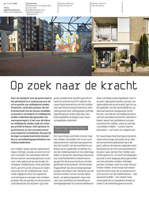 Door de aandacht voor de grote stad en het platteland is er weinig oog voor de rol en positie van middelgrote steden. Onterecht, vindt Joks Janssen. Nu het krachtenveld van de nieuwe stedelijke economie is veranderd, en middelgrote steden onderdeel zijn geworden van metropoolregio’s, is het voor de kleine en middelgrote steden zaak om scherper profiel te kiezen. Zich opnieuw te positioneren, en een sociaaleconomische toekomst te bedenken die past bij de eigen sociaaleconomische kenmerken en ontwikkeling
