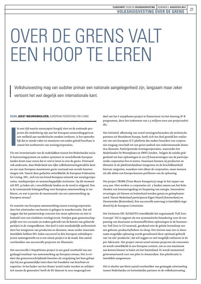 DOOR JOOST NIEUWENHUIJZEN, EUROPEAN FEDERATION FOR LIVINGIIn een tijd waarin euroscepsis hoogtij viert en de nationale pro-jecten die onderhevig zijn aan het Europese eenwordingsproceseen veelheid aan eurokritische smaken verduurt, is het opmerke-lijk dat er steeds vaker en massiever een ander geluid hoorbaar isvanuit het werkterrein van woningcorporaties.Uit een inventarisatie van de raakvlakken tussen het Nederlandse socia-le huisvestingsysteem en andere systemen in verschillende Europeselanden komt naar voren dat er veel te leren is over de grens. Uiteraardook andersom, daar Nederland een rijke volkshuisvestingstraditie kenten een naar Europese maatstaven grote voorraad aan sociale huurwo-ningen telt. Vanuit deze gedachte ontwikkelde de European Federationfor Living, EFL, zich tot een breed Europees netwerk van woningcorpo-raties, marktpartijen en wetenschappelijke instituten. Op dit momenttelt EFL 35 leden uit 7 verschillende landen en de trend is stijgend. Hoeis de toenemende belangstelling voor Europese samenwerking te ver-klaren, en wat is precies de meerwaarde van een samenwerking opEuropees niveau?De essentie van Europese samenwerking tussen woningcorporatiesdoor het uitwisselen van kennis is gelegen in waardecreatie. Dat wilzeggen dat het partnerschap concreet iets moet opleveren en niet isbedoeld voor een eindeloos overlegcircuit. Partijen gaan gemeenschap-pelijk over tot cocreatie en maken gebruik van de kennis van gelieerdepartijen in de vastgoedketen. Het doel is niet noodzakelijk uniformiteitdoor het integreren van producten en diensten, maar eerder innovatie.Inmiddels hebben EFL-leden succesvol in drie Europese subsidiepro-jecten samengewerkt en is een nieuw project in de maak. Een aantalvoorbeelden van succesvolle projecten ter illustratie.Het succesvolle I-Stay@Home project is een goed voorbeeld van eengeslaagd resultaat van samenwerking op Europees niveau. Het is evi-dent dat grensoverschrijdende kwesties als vergrijzing het best gebaatzijn bij een gezamenlijke inzet door het bundelen van krachten enexpertise. In het kader van het thema `actief ouder worden en solidari-teit tussen de generaties' heeft de EU daarom in 2012 toegezegd eendeel van het I-stay@home project te financieren via het Interreg IV-Bprogramma, door het toekennen van 2,5 miljoen euro aan projectsubsi-die.Het initiatief, afkomstig van zowel woningverhuurders als technischepartners uit Noordwest Europa, heeft zich ten doel gesteld het realise-ren van een Europees ICT-platform dat oudere huurders van corpora-ties toegang verschaft tot een groot aanbod van ondersteunende domo-tica diensten. Participerende woningcorporaties, waaronder hetNederlandse De Woonplaats en SWB Lienden, krijgen de unieke gele-genheid om hun oplossingen in 100 (!) huurwoningen van de participe-rende corporaties live te testen. Daarnaast kunnen zij producten endiensten in de platformdatabase integreren en de beschikbaarheidhiervan vergroten, waardoor niet alleen de corporaties, maar mensenuit alle delen van Europa kunnen profiteren van de oplossing.Het project TRIME (Trias Mores Energetica) vangt in het najaar van2014 aan. Hier werken 12 corporaties uit 5 landen samen aan het be?n-vloeden van bewonersgedrag ter besparing van energie. Innovatieveervaringen uit binnen en buitenland worden getest en ge?mplemen-teerd. Vanuit Nederland participeren Eigen Haard (Amsterdam) enHavensteder (Rotterdam). Een succesvolle aanvraag is inmiddels inge-diend bij de Europese Commissie.Het Zwitserse EFL lid KEOTO ontwikkelde het zogenaamde `Full ZeroConcept'. Dit is opgezet als een systematische benadering voor de toe-passing van duurzame en kosteneffici?nte oplossingen in de bouwsec-tor. Full Zero is CO neutraal, gerekend over de gehele levensloop vaneen gebouw, productie/beheer en sloop. Het streven naar een zo duur-zaam mogelijke oplossing wordt gerealiseerd door optimaal gebruikvan `on site' productie', dat wil zeggen zo veel mogelijk realiseren in depre-fabricatie. Het project omvat zowel nieuwe projecten als renovatiesen wordt ontwikkeld in een Europese context, om zo een maximumaan kennis binnen te halen uit het buitenland. Er wordt momenteelge?nventariseerd voor een pilot in Amsterdam. Een pilotlocatie isinmiddels aangewezen.Het is slechts aan klein aantal voorbeelden van geslaagde uitwisselingtussen Nederlandse en buitenlandse partners in de volkshuisvesting.21TIJDSCHRIFT VOOR DE VOLKSHUISVESTING NUMMER 4 AUGUSTUS 2014VOLKSHUISVESTING OVER DE GRENSOVER DE GRENS VALTEEN HOOP TE LERENVolkshuisvesting mag van oudsher primair een nationale aangelegenheid zijn, langzaam maar zekervertoont het wel degelijk een internationale kant.