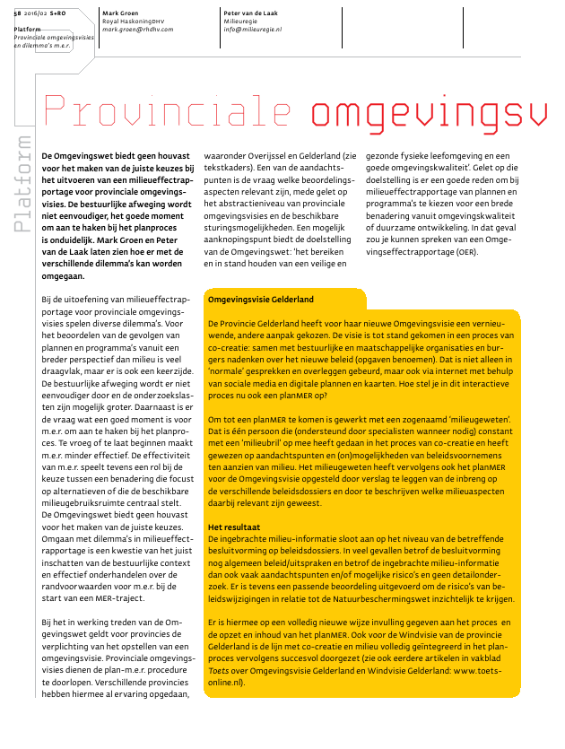 De Omgevingswet biedt geen houvast voor het maken van de juiste keuzes bij het uitvoeren van een milieueffectrapportage voor provinciale omgevingsvisies. De bestuurlijke afweging wordt niet eenvoudiger, het goede moment om aan te haken bij het planproces is onduidelijk. Mark Groen en Peter van de Laak laten zien hoe er met de verschillende dilemma’s kan worden omgegaan.
