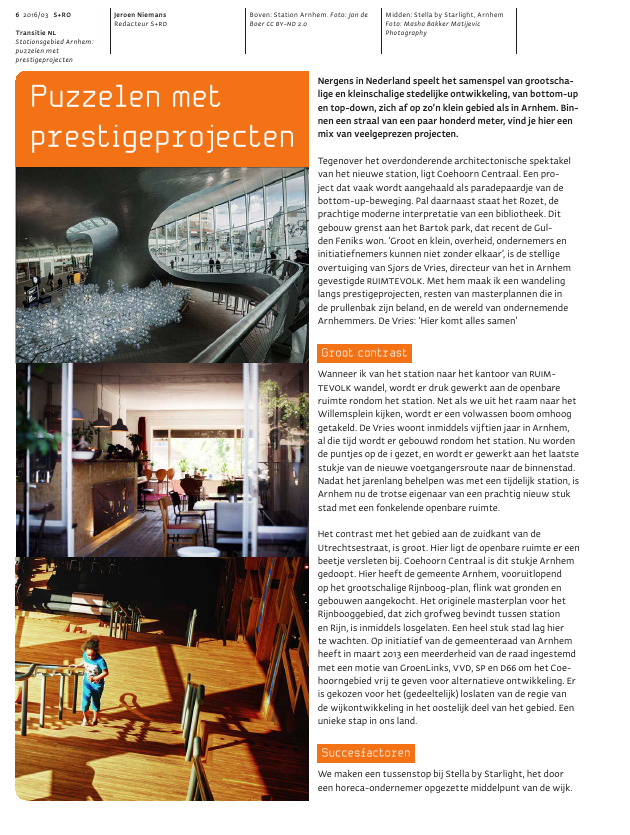 Midden: Stella by Starlight, ArnhemFoto: Masha Bakker MatijevicPhotographyBoven: Station Arnhem. Foto: Jan deBoer CC BY-ND 2.06 2016/03 S+ROTransitie NLStationsgebied Arnhem:puzzelen metprestigeprojectenJeroen NiemansRedacteur S+RONergens in Nederland speelt het samenspel van grootscha-lige en kleinschalige stedelijke ontwikkeling, van bottom-upen top-down, zich af op zo'n klein gebied als in Arnhem. Bin-nen een straal van een paar honderd meter, vind je hier eenmix van veelgeprezen projecten.Tegenover het overdonderende architectonische spektakelvan het nieuwe station, ligt Coehoorn Centraal. Een pro-ject dat vaak wordt aangehaald als paradepaardje van debottom-up-beweging. Pal daarnaast staat het Rozet, deprachtige moderne interpretatie van een bibliotheek. Ditgebouw grenst aan het Bartok park, dat recent de Gul-den Feniks won. `Groot en klein, overheid, ondernemers eninitiatiefnemers kunnen niet zonder elkaar', is de stelligeovertuiging van Sjors de Vries, directeur van het in Arnhemgevestigde RUIMTEVOLK. Met hem maak ik een wandelinglangs prestigeprojecten, resten van masterplannen die inde prullenbak zijn beland, en de wereld van ondernemendeArnhemmers. De Vries: `Hier komt alles samen'Groot contrastWanneer ik van het station naar het kantoor van RUIM-TEVOLK wandel, wordt er druk gewerkt aan de openbareruimte rondom het station. Net als we uit het raam naar hetWillemsplein kijken, wordt er een volwassen boom omhooggetakeld. De Vries woont inmiddels vijftien jaar in Arnhem,al die tijd wordt er gebouwd rondom het station. Nu wordende puntjes op de i gezet, en wordt er gewerkt aan het laatstestukje van de nieuwe voetgangersroute naar de binnenstad.Nadat het jarenlang behelpen was met een tijdelijk station, isArnhem nu de trotse eigenaar van een prachtig nieuw stukstad met een fonkelende openbare ruimte.Het contrast met het gebied aan de zuidkant van deUtrechtsestraat, is groot. Hier ligt de openbare ruimte er eenbeetje versleten bij. Coehoorn Centraal is dit stukje Arnhemgedoopt. Hier heeft de gemeente Arnhem, vooruitlopendop het grootschalige Rijnboog-plan, flink wat gronden engebouwen aangekocht. Het originele masterplan voor hetRijnbooggebied, dat zich grofweg bevindt tussen stationen Rijn, is inmiddels losgelaten. Een heel stuk stad lag hierte wachten. Op initiatief van de gemeenteraad van Arnhemheeft in maart 2013 een meerderheid van de raad ingestemdmet een motie van GroenLinks, VVD, SP en D66 om het Coe-hoorngebied vrij te geven voor alternatieve ontwikkeling. Eris gekozen voor het (gedeeltelijk) loslaten van de regie vande wijkontwikkeling in het oostelijk deel van het gebied. Eenunieke stap in ons land.SuccesfactorenWe maken een tussenstop bij Stella by Starlight, het dooreen horeca-ondernemer opgezette middelpunt van de wijk.Puzzelen metprestigeprojectenOnder: Cultuurhuis Rozet, Arnhem.Bron: Bond van NederlandseArchitecten, Neutelings RiedijkArchitecten. Foto: Scagliola BrakkeeCC BY 2.0Boven: Aardvarken BartokparkArnhem. Foto:Ton Schulten CC BY-ND2.0Pagina 6 onder: Cultuurhuis Rozet,Arnhem. Bron: Bond van NederlandseArchitecten, Neutelings RiedijkArchitecten. Foto: Scagliola BrakkeeCC BY 2.0S+RO 2016/03 7Transitie NLStationsgebied Arnhem:puzzelen metprestigeprojectenHet heeft de uitstraling van een huiskamer van het gebied.Drie jaar na de raadsmotie is de wijk volgestroomd met on-dernemers. Van grafisch ontwerpers tot een energieco?pe-ratie en van bierkoeriers tot RTV Arnhem, het zit er allemaal.`Het initiatief Coehoorn Centraal heeft ervoor gezorgd datde leegstaande panden nu op een nuttige manier worden ge-bruikt door kleine bedrijven en startende ondernemers. Hetheeft de stad geleerd met een andere blik naar gebiedsont-wikkeling en de potenties en het eigenaarschap van de stadte kijken. Of Coehoorn de belofte van de `creatieve hotspotvan Oost Nederland' gaat waarmaken, valt nog te bezien.De ondernemers komen met name af op het buitenkansjevan de extreem lage huren in het centrum van de stad. Inhetzelfde gebied staan dezelfde vierkante meters, die tegenmarktprijzen worden aangeboden, gewoon leeg. Financieelen qua risico's leunt het project stevig op de schouders enmedewerking van de gemeente.SamenspelWe wandelen verder en komen aan bij het Bartokpark. Mid-denin dit parkje ligt het Aardvarken, een gigantisch beeld datdoor kinderen naar hartenlust wordt gebruikt om overheente klauteren. Het is een voorbeeld van wat ondernemersvoor een stad kunnen betekenen. De Vries: `Het idee van hetBartokpark komt uit de koker van enkele creatieve on-dernemers uit de stad. Wat niet veel mensen weten is datBurgers Zoo de stad het Feestaardvarken heeft geschonken.Ondernemers die op een dergelijke wijze een bijdrage leverenaan de stad, moet je koesteren. Naast creatieven kunnendus ook grote ondernemingen echt stadsmakers zijn.' Hijwijst op het belang van het samenspel van initiatiefnemers,ondernemers en overheid. `Tegenover het park ligt boven-dien Rozet, een bruisende plek met diverse maatschappelijkeen commerci?le voorzieningen, en onlangs verkozen tot eenvan de mooiste gebouwen van de wereld. Een prestatie vanformaat, een geweldig stukje stad maken. Niet alleen van dearchitect, maar laten we niet vergeten: ook van de overhe-den. Het is mooi om te zien hoe hier verschillende puzzel-stukjes in elkaar vallen. Wat mij betreft een van de meestunieke stukjes gebiedsontwikkeling van Nederland.'Daar waar het stationsgebied en Coehoorn Centraal tweegeschieden werelden lijken te zijn, versterken de verschillen-de ontwikkelingen in de omgeving van het Bartokpark elkaar.Arnhem laat hier zien hoe het samenspel van initiatiefne-mers, ondernemers en overheid veel moois kan opleveren.Op deze plek krijgt de term organisch ontwikkelen betekenis.Een beetje loslaten, een beetje sturen en een beetje geluk,vinden elkaar hier. Een stukje stad om trots op te zijn. Wandelen door veranderend NederlandDit jaar wandelt Jeroen Niemans door veranderend Nederland:plekken waar de transitie zichtbaar is en de toekomst in d