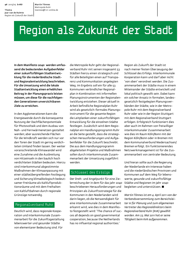 In dem Manifesto 2040  werden umfassend die bedeutenden Aufgabenfelder einer zukunftsfähigen Stadtentwicklung für die niederländische Stadt- und Regionalentwicklung beschrieben. Für die Umsetzung wird die lokale Stadtentwicklung einen erheblichen Beitrag in der Planungspraxis leisten müssen, um diese für die nachfolgenden Generationen unverzichtbaren Ziele zu erreichen.