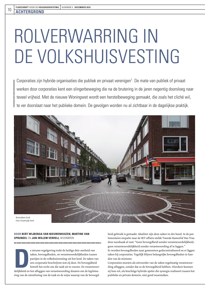Corporaties zijn hybride organisaties die publiek en privaat verenigen1. De mate van publiek of privaat werken door corporaties kent een slingerbeweging die na de brutering in de jaren negentig doorsloeg naar teveel vrijheid. Met de nieuwe Woningwet wordt een herstelbeweging gemaakt, die zoals het cliché wil, te ver doorslaat naar het publieke domein. De gevolgen worden nu al zichtbaar in de dagelijkse praktijk.