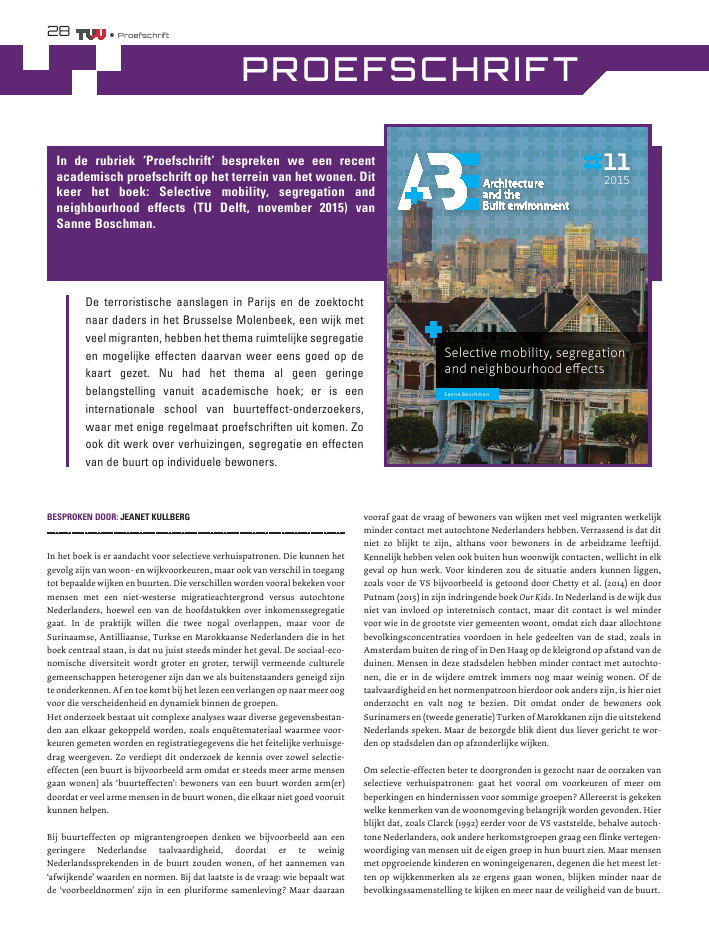 In de rubriek ‘Proefschrift’ bespreken we een recent academisch proefschrift op het terrein van het wonen. Dit keer het boek: Selective mobility, segregation and neighbourhood effects (TU Delft, november 2015) van Sanne Boschman.