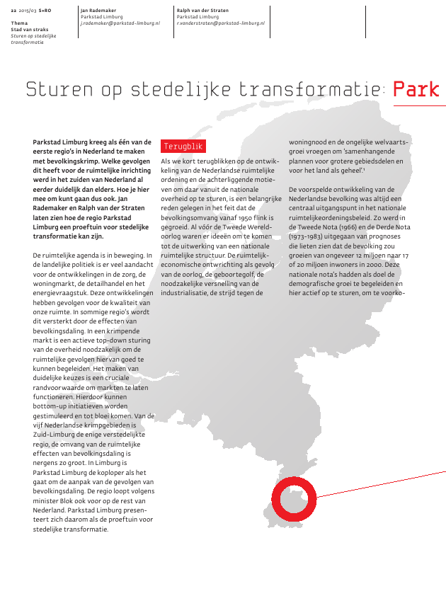 22 2015/03 S+ROThemaStad van straksSturen op stedelijketransformatieJan RademakerParkstad Limburgj.rademaker@parkstad-limburg.nlRalph van der StratenParkstad Limburgr.vanderstraten@parkstad-limburg.nlParkstad Limburg kreeg als ??n van deeerste regio's in Nederland te makenmet bevolkingskrimp. Welke gevolgendit heeft voor de ruimtelijke inrichtingwerd in het zuiden van Nederland aleerder duidelijk dan elders. Hoe je hiermee om kunt gaan dus ook. JanRademaker en Ralph van der Stratenlaten zien hoe de regio ParkstadLimburg een proeftuin voor stedelijketransformatie kan zijn.De ruimtelijke agenda is in beweging. Inde landelijke politiek is er veel aandachtvoor de ontwikkelingen in de zorg, dewoningmarkt, de detailhandel en hetenergievraagstuk. Deze ontwikkelingenhebben gevolgen voor de kwaliteit vanonze ruimte. In sommige regio's wordtdit versterkt door de effecten vanbevolkingsdaling. In een krimpendemarkt is een actieve top-down sturingvan de overheid noodzakelijk om deruimtelijke gevolgen hiervan goed tekunnen begeleiden. Het maken vanduidelijke keuzes is een crucialerandvoorwaarde om markten te latenfunctioneren. Hierdoor kunnenbottom-up initiatieven wordengestimuleerd en tot bloei komen. Van devijf Nederlandse krimpgebieden isZuid-Limburg de enige verstedelijkteregio, de omvang van de ruimtelijkeeffecten van bevolkingsdaling isnergens zo groot. In Limburg isParkstad Limburg de koploper als hetgaat om de aanpak van de gevolgen vanbevolkingsdaling. De regio loopt volgensminister Blok ook voor op de rest vanNederland. Parkstad Limburg presen-teert zich daarom als de proeftuin voorstedelijke transformatie.Sturen op stedelijke transformatie: ParkTerugblikAls we kort terugblikken op de ontwik-keling van de Nederlandse ruimtelijkeordening en de achterliggende motie-ven om daar vanuit de nationaleoverheid op te sturen, is een belangrijkereden gelegen in het feit dat debevolkingsomvang vanaf 1950 flink isgegroeid. Al v??r de Tweede Wereld-oorlog waren er idee?n om te komentot de uitwerking van een nationaleruimtelijke structuur. De ruimtelijk-economische ontwrichting als gevolgvan de oorlog, de geboortegolf, denoodzakelijke versnelling van deindustrialisatie, de strijd tegen dewoningnood en de ongelijke welvaarts-groei vroegen om `samenhangendeplannen voor grotere gebiedsdelen envoor het land als geheel'.1De voorspelde ontwikkeling van deNederlandse bevolking was altijd eencentraal uitgangspunt in het nationaleruimtelijkeordeningsbeleid. Zo werd inde Tweede Nota (1966) en de Derde Nota(1973-1983) uitgegaan van prognosesdie lieten zien dat de bevolking zougroeien van ongeveer 12 miljoen naar 17of 20 miljoen inwoners in 2000. Dezenationale nota's hadden als doel dedemografische groei te begeleiden enhier actief op te sturen, om te voorko-S+RO 2015/03 23ThemaStad van straksSturen op stedelijketransformatieOnderbankenBrunssumLandgraafHeerlenNuthVoerendaalSimpelveldKerkradeNuthWijnandsradeSchimmertHulsbergKlimmenRansdaalVoerendaalUbachsbergSimpelveldBocholtzHeerlenRimburgUbach over WormsSchinveldJabeekBingelradeMerkelbeekVaesradeDuitslandNederlandmen dat deze zou leiden tot `rampzaligegevolgen' zoals de ongeleide uitdijing ensamensmelting van de grote steden inde Randstad. Het antwoord hierop wasde gebundelde deconcentratie waarbijzogenaamde groeikernen (onder anderePurmerend, Zoetermeer, Spijkenisse)werden aangewezen. Hier kondenmensen wonen, werken en recre?renwaardoor de druk op de grote stedenzou verminderen en de suburbanisatie-golf kon worden gecontroleerd. Vanafde Nota Ruimte (2004) is de ruimtelijkeordening gaandeweg gedecentraliseerdvanuit de filosofie dat vooral deprovincies en gemeenten aan de latstaan voor de fysieke leefomgeving,stad Limburg proeftuin bevolkingskrimpgelet op hun specifieke gebiedskennisen samenwerking met regionalepartners.Regionale demografischeverschillenRecente bevolkingsprognoses voorspel-len dat de Nederlandse bevolkingsom-vang tot 2060 geleidelijk met ??nmiljoen inwoners zal groeien.2 Ditbetekent dat Nederland zo goed alsafgebouwd is en het volume vanuitbreiding relatief beperkt is. Dekomende decennia zullen vooralvernieuwing, herstructurering entransformatie van het bestaandebebouwd gebied centraal staan. Eenbelangrijke kanttekening is dat debevolkingsontwikkeling per regioverschilt. Zo zullen er regio's zijn die inde toekomst minder inwoners zullenhebben dan nu, regio's die te makenkrijgen met bevolkingsgroei en regio'swaar de bevolkingsomvang de komendejaren stabiel zal blijven. De krimpregio'sZuid-Limburg, Achterhoek, Zeeuws-Vlaanderen, Noordoost-Friesland enNoordoost-Groningen zijn koploperre-gio's als het gaat om bevolkingsdaling.Maar ook andere delen van Nederland,zoals Purmerend, Spijkenisse enRotterdam-Zuid krijgen hiermee optermijn te maken.3Daarmee wordt bevolkingsdaling, totop heden vooral gezien als een regio-naal thema voor de randen vanNederland, langzaamaan een vraagstukdat zich op het landelijk schaalniveaumanifesteert. De `oude' groeikernenhebben het moeilijk, de bevolkingvergrijst en jongeren trekken steedsvaker naar de grote steden.4 Dit maaktregionale afstemming over bijvoorbeeldwoningbouwprogramma's een vereiste,omdat bevolkingsgroei en -daling tweekanten van dezelfde medaille zijn.Beslissingen over de realisatie ofuitbreiding van een woonwijk ofwinkelcentrum in de ene gemeentekunnen invloed hebben op buurge-meenten. Dat geldt in eerste instantienatuurlijk op regionaal niveau, maar dielijn kan gemakkelijk worden doorge-trokken naar het nationale schaal-niveau. Daarmee is bevolkingsdaling, infeite demografie in algemene zin, mis-schien wel het belangrijkste vraagstukin het ruimtelijkeordeningsbeleid vanveel Nederlandse steden en regio's. >>24 2015/03 S+ROThemaStad van straksSturen op stedelijketransformatieDe effecten vanbevolkingsdalingDe effecten van bevolkingsdalingworden het meest zichtbaar door eentoenemende leegstand in vastgoedsec-toren zoals woningen en winkels, datleidt tot een onder druk staandvoorzieningenniveau en daaruitvoortkomend