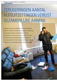6TIJDSCHRIFT VOOR DE VOLKSHUISVESTING NUMMER 4 AUGUSTUS 2014TERUGDRINGEN AANTALHUISUITZETTINGEN VEREISTGEZAMENLIJKE AANPAKEenhuisuitzettinginRijswijkbeginditjaaralsgevolgvanonderandereeenhuurachterstand(FotoPeterHilz/HollandseHoogte)Hoewel de economie inmiddels weer voorzichtig aantrekt,neemt het aantal huisuitzettingen nog altijd toe. Steeds meerhuishoudens verkeren in dusdanig grote financi?leproblemen, dat zij zelfs de huur of de hypotheek niet meerkunnen betalen en uiteindelijk worden gedwongen hunwoning te verlaten. Om het aantal huisuitzettingen terug tedringen is een gezamenlijke aanpak dringend noodzakelijk.ACHTERGROND7TIJDSCHRIFT VOOR DE VOLKSHUISVESTING NUMMER 4 AUGUSTUS 2014ACHTERGROND8TIJDSCHRIFT VOOR DE VOLKSHUISVESTING NUMMER 4 AUGUSTUS 2014DOOR ERIC HARMS, FREELANCE JOURNALIST @EMHARMS"E?n op de zes huishoudens in Nederland loopt eenrisico op problematische schulden, heeft proble-matische schulden of zit in een schuldhulpverle-ningstraject." Dat even droge als schokkende feitmeldt staatssecretaris Jetta Klijnsma van SocialeZaken en Werkgelegenheid eind maart 2014 in antwoord op vragen vande Tweede Kamerfractie van de SP.De effecten hiervan zijn ook op de woningmarkt goed merkbaar, zoblijkt uit de cijfers. Zowel in de koop- als in de huursector nemen debetaalachterstanden toe. Voor wat betreft de koopsector geeft deHypotheekbarometer van het Bureau Krediet Registratie aan dat er op1 april 2014 in totaal 100.581 consumenten geregistreerd stonden meteen betalingsachterstand op de hypotheek. Dat zijn er 8.769 meer daneen half jaar eerder.Uit de gegevens van de Nationale Hypotheekgarantie blijkt dat 2.265huishoudens in de eerste helft van 2014 een beroep hebben moetendoen op de garantie vanwege een noodzakelijke verkoop van dewoning met verlies. Arjen Gielen, algemeen directeur van hetWaarborgfonds Eigen Woningen, houdt er rekening mee dat dit aantalde komende tijd verder zal stijgen. In het begeleidende persberichtstelt hij daarover: "Bij een aantrekkende markt zal het aantal woning-verkopen toenemen, echter frequent met een restschuld, omdat veelwoningen nog `onder water' staan. Daarnaast is er sprake van een volu-me-effect, omdat in de afgelopen jaren meer garanties zijn verstrekt."EXECUTIEVEILINGJaarlijks monden 2.000 tot 3.000 van de problematische gevallen in dekoopsector uit in een executieveiling. Volgens het Kadaster waren dater in 2012 nog 2.488, en liep het aantal in 2013 terug tot 1.863. De eerstezes maanden van 2014 stijgt het maandelijks gemiddelde weer licht totiets boven de 200 per maand. Volgens Bart van Leeuwen, woordvoer-der Nederlandse Vereniging van Banken is dat echter nog geen redentot zorg. "De aantallen per maand vallen nog steeds binnen de margesvan het jaargemiddelde." Het aantal executieveilingen typeert hij inhet algemeen als laag, zeker in relatie tot de vier miljoen koopwonin-gen in Nederland. "Ondanks de crisis komen niet veel mensen snel inbetalingsproblemen.""De aantallen per maand vallen nog steedsbinnen de marges van het jaargemiddelde"Dat is echter slechts een deel van het verhaal, zo stelt Dick-JanAbbringh van Purpose Management Consulting. Dit bureau helptgeldverstrekkers onder andere bij het voorkomen van (betalings)pro-blemen van consumenten met hypothecaire achterstanden. Veel zakenkomen volgens hem namelijk in het onderhandse verkoopcircuitterecht. "Precieze cijfers daarover zijn niet bekend, maar het aantalmensen dat gedwongen het huis uit moet, ligt eerder rond de 10.000tot 12.000 huishoudens per jaar."Banken zijn al een tijdje niet meer zo happig op executieveilingen, ver-klaart hij de opkomst van de onderhandse verkoop. "Daarmee gaatnamelijk veel geld verloren. Beter is het om de woning via de regulierekanalen te koop te zetten. Je hebt het dan nog steeds over gedwongenverkoop, omdat de klant zijn hypotheek niet kan betalen en het ver-koopproces door de bank wordt ge?nitieerd. Maar de opbrengst ligtdoorgaans hoger dan bij een executieveiling. Na verkoop via een exe-cutieveiling blijft meestal een restschuld van rond de 80.000 euro over.Bij gedwongen verkoop via het reguliere kanaal blijft er een restschuldover van gemiddeld 45.000 tot 50.000 euro. Dus er is ook de bankenveel aan gelegen om de verkoop onderhands te regelen."Wat niet wegneemt dat veel banken hun verlies al direct nemen.Abbringh: "Van een kale kip kun je nu eenmaal niet plukken.Gemiddeld komt er circa 10 procent van de uitstaande schuld terug,maar banken gaan er meestal toe over om de vordering direct in deboeken af te schrijven."ONTBINDING HUURCONTRACTIn de sociale huursector zijn de betalingsproblemen vele malen groter.In maar liefst 23.100 gevallen werd uiteindelijk door de rechtbankgeoordeeld dat het huurcontract mocht worden ontbonden, blijkt uitonderzoek van Aedes, vereniging van woningcorporaties, naar huis-uitzettingen in 2013. Bij 6.980 huishoudens is ook daadwerkelijk over-gegaan tot huisuitzetting, wat een stijging is van 8 procent ten opzich-te van 2012."Corporaties zien het als hun opdracht om mensente huisvesten en niet uit huis te zetten"In 88,4 procent van die gevallen was sprake van een huurachterstand(in 2012: 79,3). Van de corporaties die hebben deelgenomen aan hetonderzoek geeft dan ook 90 procent aan dat de economische crisis devoornaamste oorzaak van huisuitzetting is. De totale betalingsachter-stand bij woningcorporaties lag in 2013 op ruim 250 miljoen euro.Van de huishoudens die uit huis worden gezet blijkt 15 procent eenalleenstaande te zijn in de leeftijd van 30 tot 60 jaar. Alleenstaandejongeren tussen 18 en 30 jaar komen met 9 procent op de tweedeplaats. Het kleinste deel wordt gevormd door gezinnen met kinderen(2 procent) en eenoudergezinnen (3 procent).Dat er uiteindelijk toch bijna 7.000 huishoudens op straat moetenworden gezet, is ook voor woningcorporaties bijzonder ingrijpend,aldus Nathalie Boerebach van Aedes. "Corporaties zien het immers alshun opdracht om mensen te huisvesten en niet uit huis te zetten. Datverklaart ook de grote be