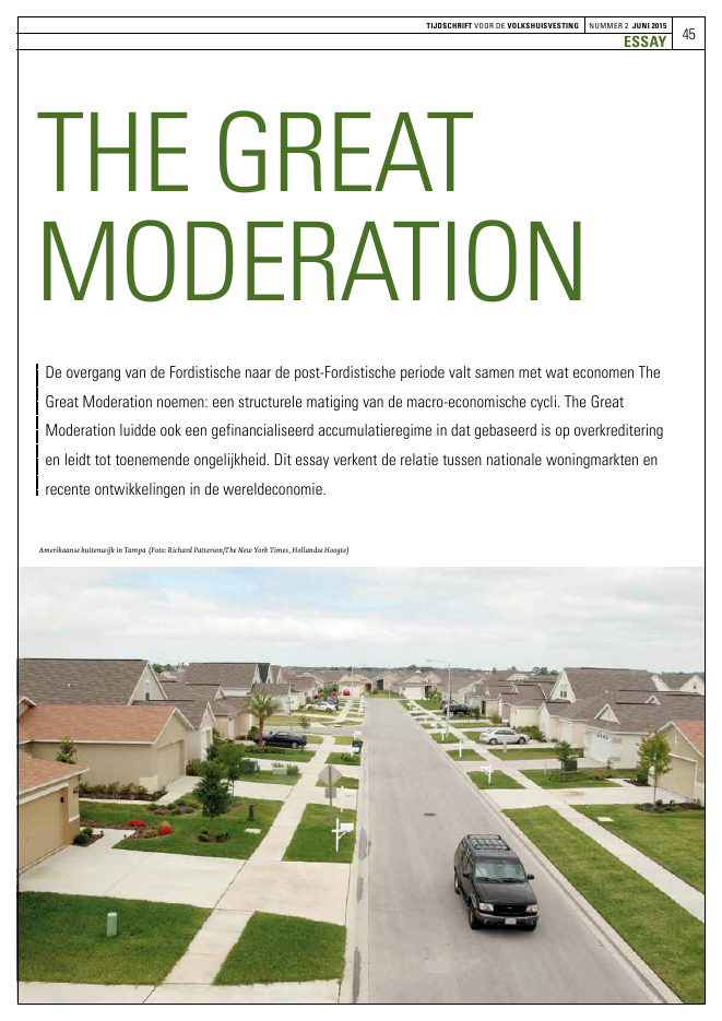 45TIJDSCHRIFT VOOR DE VOLKSHUISVESTING NUMMER 2 JUNI 2015ESSAYTHE GREATMODERATIONDe overgang van de Fordistische naar de post-Fordistische periode valt samen met wat economen TheGreat Moderation noemen: een structurele matiging van de macro-economische cycli. The GreatModeration luidde ook een gefinancialiseerd accumulatieregime in dat gebaseerd is op overkrediteringen leidt tot toenemende ongelijkheid. Dit essay verkent de relatie tussen nationale woningmarkten enrecente ontwikkelingen in de wereldeconomie.AmerikaansebuitenwijkinTampa (Foto:RichardPatterson/TheNewYorkTimes,HollandseHoogte)46TIJDSCHRIFT VOOR DE VOLKSHUISVESTING NUMMER 2 JUNI 2015THEMA BETAALBAARHEIDDOOR MANUEL AALBERS, AFDELING GEOGRAFIE, KU LEUVEN*De wereldwijde financi?le crisis barstte los toen zich groteproblemen voor deden op de Amerikaanse subprime-hypotheekmarkt. Niet alleen in de V.S., maar ook in ande-re landen, zoals Nederland, wordt de bovenmatige stij-ging van de huizenprijzen in de jaren voor de crisisbeschouwd als de belangrijkste reden waarom de huizenprijzenbegonnen te dalen. Op die wijze wordt de mondiale crisis toch op nati-onaal niveau verklaard: huizenprijzen daalden nationaal, omdat ze opnationaal niveau te veel waren gestegen. Maar de timing van de inter-nationale woningmarktcrisis is wel degelijk mondiaal van aard: definanci?le crisis was een mondiale crisis, hoewel dat niet wil zeggendat elke plek op aarde er door werd getroffen ? laat staan in dezelfdemate. Nooit eerder in de geschiedenis gingen de woningprijzen in zoveel verschillende (vooral westerse) landen op hetzelfde momentomlaag. Een mondiale financi?le crisis hebben we eerder gezien, eenmondiale woningmarktcrisis niet. Er is dus sprake van een synchroni-satie van de conjunctuurbewegingen op de verschillende nationalewoningmarkten.Om deze synchronisatie te begrijpen, maak ik gebruik van een periodi-sering van de ontwikkelingen op de woningmarkt en in het volkshuis-vestingsbeleid. Ik onderscheid vier perioden: de premoderne periode,de moderne of Fordistische periode, de hoogneoliberale of post-For-distische periode en de opkomende post-crisis periode. In dit essayricht ik me vooral op de verschuiving van de tweede naar de derdeperiode en de val van het neoliberale woningmarktmodel tijdens demondiale financi?le crisis. Mijn punt is niet dat die crisis de oorzaak isvan de afbraak van het post-Fordistische model, maar juist dat de ver-schuiving naar dit model een dynamiek introduceerde die een paardecennia later leidde tot een mondiale crisis."The Great Moderation is de macro-economischecyclus die begon in 1984 en gekenmerkt wordtdoor meer economische stabiliteit en kleinerebruto binnenlands product (bbp) enrenteschommelingen dan in voorgaande cycli"Ik maak gebruik (sommigen zullen zeggen: misbruik) van het begripThe Great Moderation in het analyseren van de verschuiving van detweede naar de derde periode. The Great Moderation is de macro-econo-mische cyclus die begon in 1984 en gekenmerkt wordt door meer econo-mische stabiliteit en kleinere bruto binnenlands product (bbp) en rente-schommelingen dan in voorgaande cycli. In mijn optiek was de zogehe-ten Great Moderation niet zozeer een matiging van de macro-economi-sche cycli, maar het begin van de financialisering van de economie in talvan domeinen, met inbegrip van de woningmarkt. Financialiseringduidt op een toenemende dominantie van financi?le actoren, praktijkenen vertogen, waarbij een steeds groter deel van winst van de economieof een sector daarvan in financi?le markten wordt gemaakt en steedsminder in de re?le economie. Het gaat dus niet alleen om een grotere rolvan `ouderwetse' financi?le instellingen als banken en `nieuwe' als hedgefunds, maar ook om de toenemende invloed van financi?le markten inandere domeinen van de economie en samenleving. De derivatenschan-dalen bij Vestia en het midden- en kleinbedrijf zijn daar extreme voor-beelden van, de steeds grotere hypotheeklasten van steeds meer huis-houdens een meer alledaagse. In de hoog-neoliberale periode is er spra-ke van een ware kredietexplosie die de prijzen van vastgoed tot grotehoogten deed stijgen. Wat leek op een structurele matiging van macro-economische schommelingen bleek gepaard te gaan met de opbouw vaneen zeepbeleconomie. De recente mondiale crisis betekende het eindevan The Great Moderation maar vooralsnog niet van de GroteFinancialisering die ermee gepaard ging.De periodisering die ik voorstel is vooral heuristisch van aard: hetgeeft geen volledig accuraat beeld van de werkelijke ontwikkelingen,maar is een benadering die ons in staat moet stellen om beter tebegrijpen wat er is gebeurd. Deze periodisering is niet bedoeld als eenmodel van de wereld of een keurslijf dat alle landen zou moeten pas-sen. Zoals alle periodiseringen is de mijne problematisch omdat hetzowel de gelijkenissen binnen een bepaald tijdsbestek als de verande-ringen ertussen benadrukt, terwijl er in werkelijkheid in elk tijdperksprake was van geleidelijke en constante verandering.Mijn punt is ook niet dat alle nationale woningmarktmodellen numeer op elkaar lijken dan bijvoorbeeld dertig jaar geleden (de zogehe-ten `convergentiethese'), maar dat veel landen in dezelfde richting zijngeschoven. Denk aan een hoger eigenwoningbezit en grotere hypo-theekschuld zonder daarbij hun essenti?le verschillen per se te verlie-zen. Hierbij spelen zeitgeist-bepalers als globalisering, de val van hetcommunisme en de neoliberale ideologie een belangrijke rol. In ditessay bespreek ik de verschillende perioden, met uitzondering van depre-moderne periode, zodat ik meer ruimte kan besteden aan de kri-tieke momenten waarop het ene huisvestingsmodel door het anderewerd vervangen.DE MODERNE OF FORDISTISCHE PERIODEEen eerste kenmerk van de moderne of Fordistische periode op dewoningmarkt was de productie van huizen voor de massa. Dit wil zeg-gen, de bouw van grote aantallen huizen voor een brede dwarsdoor-snede van de bevolking, met name de arbeiders en de middenklasse.Een tw