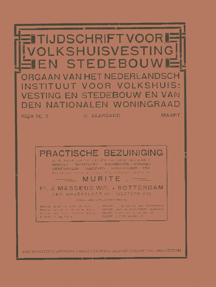 EaTIJDSCHRIFTVOOR__,IVOLKSHUISVESTINGIt3EN STEDEBOUWE^"ORGAAN VAN HET NEDERLANDSCHINSTITUUT VOOR VOLKSHUIS:VESTING EN STEDEBOUW EN VANDEN NATIONALEN WONINGRAAD1924 NS 3 5'JAARGANG MAARTPRACTISCHE BEZUINIGINGop de kosten van het bekfeeden van muren en plafonds inWINKELS - MAGAZIJNEN - WOONHUIZEN - GARAGESZIEKENKUiZEN - FABRIEKEN - LABORATORIA - ENZ.doop toepassing van ons nieuwe bepleisteringsmateriaal== MURITE ==FA. J. MASSeUS WIN. . ROTTERDAMGED. BOTERSLOOT 119 - TELEFOON 3186VRAAGT ONS BOEKJE OVER MURITEMURITE wordt zoo hard als steenMURITE kan direct beschilderd wordenMURITE kan direct behangen wordenMURITE is afwaschbaarMURITE is hygilnischer dan tegelbekleedingMURITE geeft een NAADLOOZE oppervlakteMURITE krimpt niet en zet niet uitMURITE is ZEER GOEDKOOPVAN MUNSTER'S UITGEVERS MAATSCHAPPU-HEERENGRACHT246-AMSTERDAMVAN OMMEREN & Co.PAUWSTRAAT - ARNHEMMHMHH TELEFOON 800 B^HMMSPIEGEL-, VENSTERGLA8. VERF-WAREN, GESLEPEN GLAS ZOOWELBLANK AL8 VERZILVERD8PECIAAL VOORMEUBELMAKER8 EN CAR0S8ERI E-FABRi KANTENLIJNBAAN 47 TELEFOON 990DORDRECHTLcvcrt U ALLE soorten GLAS voor de BOUW-BEDRIJVfiN tegen uiterst concurrente prijzen.Specialiteit in fijne LAKKEN en VERNISSEN.Alleenverkoop voor DORDRECHT en Omstrekenvan de beroemde VELUVINEVERVEN.-- VRAAGT PRIJS --rwiMyiriuiMBiaiaiiiigniiaFiiiaiaii^^CABOTINEHOUTBEDERFWERENDE CREOSOOT-OLIEBEITSEN-VERF IN ALLE KLEURENHet beste ter wereld en alleendan echt en gegarandeerd, wan-Deer emballage gezegeld B. & Co.I levert billijk de Fa. BUDDING & Co.I CORN. TROOSTSTRAAT 59 - AMSTERDAMg Tclefoon 23287& C2.PYTHAGORASSTRAAT 1AMSTERDAM-TEL. 22393??BELAST ZICH MET HET UITVOEREN VANGECOMBINEERDEN WERKEN,GEWAPEND EN ONGEWAPEND BETON===== EN BOUWWERKEN ======N. V. Behangers-Fournituren-MaatschappijJ. OFTENAmsterdam, Singel 68Telefoon 35685 en 45234Na 6 uur No. 27630Fiiiaal: RotterdamSchiekade 182Telefoon 11208ma^ WILHELMINASTRAAT 14Telegram- Adres: HUBENET 'sQRAVENHAGE Telefoon Intercommunaal No. B. 677Bankiers: OE TWENTSCHE BANK 'sGravenhagePostcheque en Girodlenst 's GRAVENHAGE No. 43502Handel in materialen ter verharding van Dijken en Wegen -- BASALTSTEENSLAG in alle afmetingenBASALTSPLIT en -ZAND voor Beton en Basaltinetegels -- Basaltzullen, Zetsteen, Stortsteen, Krotzen enGrenspalen -- KEIEN en Trottoirbanden uit Duitsche, Belgische en Zweedsche groevenC. VAN KASTEEl - AMSTERDAM Ant. t M - Tel. Mllevert alle voorkomende beeld- en steenhouwwerken In HARDSTEEN - GRANIET - ZANDSTEENKALKSTEEN - MARMER - TUFSTEEN -- Schoorsteenmantels en LambriseeringNatuursteenhandel Electr. Steenhouwerij MarmerbewerkingUAVAHOUTHiS.H. DE JONGH Jr.AANNEIVIER VAN LOOD^,ZINK- EN LEiWERKENI H, I[LEF. 25501AUTO-TRANSPORT EXT.O.P.N. ENGELBLIK-- TELEFOON 43982 --PRINSENEILAND 12AMSTERDAMVERVOER VANSTEIGER- EN B OUWM ATER lALE"INTARSIA NATURA-MARQUETERIEFTSISA P. F. BAVINKle JAN STEENSTRAAT124, AMSTERDAMENGROS DETAIL - TELEGR.-ADRES INTARSIA - IIWPORT EXPORTUITHEEMSCHE FINEER -- INLEG BIEZENINLEG MOTIEVEN -- PARELMOER -- IVOORHUES WOFDT VERVmiROIGD VOIGENS ELK ONIWERP Of lEEKElG - BERROflND HEI EERE-DiPlOMll OP DE HUlSVllJMENTOflHSlELLINB IE HMLEM 1916BUITENGEWOON GROOTECOLLECTIE -- -- ZEERLAGEPRIJZENH. J. NIEBERG & Co.AANNEMER VAN GEWAPEND BETON EN TIMMERWERKENPALMGRACHT 68^ - TELEFOON 33396 - AMSTERDAMLOON-ZAGERIJ en -SCHAVERIJ > I. SPETTERRuyschstraat 83-83^ - AMSTERDAM - Telefoon 24885, na vijf uur 24017OP DIT GEBIED OUDSTE FIRWIA TE DEZER STEDEARTIKELEN 57 1 'HRKzij als bewoner kunnen worden toegelaten.Ondanks al deze verlangens, eischen en voor-waarden bevolkte zich het dorp snel. Eeti tram-boot, twee andere bootlijnen en een autobus-onderneming voorzien thans in het vervoer.In 1923 konden drie honderd andere woningenaan het dorp worden toegevoegd, waarvoor ge-lukkig de beklemmende rijksvoorwaarden nietgolden. De scheepsbouwarbeiders en 00k jong-gehuwden konden zich 00k in het dorp vestigen.Naast een 0ns Huis en een Openbare Leeszaalmoet er eerlang een gebouw voor gemeenschaps-doeleinden worden geopend. Tuindorp-Oostzaantelt achttien vereenigingen -- als buurtvereeniging,speeltuinvereeniging, hoenderclub, harmonie-club,sportclubs, enz. enz. De Hollandsche meening,dat vergaderen de hoogste uiting van kultuur is,bestaat in Tuindorp-Oostzaan van de opening af.Bijzonder eigenaardig was de gewaarwording,dat elke nieuwe bewoner, komende van de etageof halve etage uit de stad, zich het buitenlevenniet anders kon denken, dan met het houdenvan kippen en ander gevogelte. De liefde voorplanten bleek bij de aan de natuur ontwendegezinnen veel geringer. De groote voorliefde voorplanten trof men wel aan bij de karpaarden uit destad. De ligustrumhagen bleken bij deze viervoetersuit de stad in bijzonderen smaak te vallen.zaken van de verhuizingen zullen nog nader wordenonderzocht.Leegstaande woningen komen vrijwel niet voor,de woningen worden alle grifweg wederom ver-huurd. Wel is gebleken dat rasechte Amsterdam-mers liever terug trekken naar de binnenstad. --Eerst na enkele geslachten zal 00k de stadsbewonerde buitenlucht meer gaan waardeeren. Bij eendeel der bewoners is het verlangen naar het stichtenvan een bewonersraad groot. In deze tijden vanbedrijfsorganisatie en medezeggenschap is zulkeen verlangen volkomen verklaarbaar. Een ver-gadering meer of minder tellen wij Amsterdam-mers niet meer !Het totaal huurbedrag bedraagt / 324.098.36per jaar. De huurschuld bedroeg / 1.507.25.Bijgaande illustraties geven eenige bijzonder-heden van het Tuindorp. Het ligt in de bedoelingomtrent den bouw en de exploitatie een bijzonderepublicatie te doen verschijnen, waarin overzichtenvan kosten e.d. zullen worden opgenomen.Aan het verlangen van de redactie reeds thansin het kort eens iets mede te deelen, meenikechterbij dezen te hebben voldaan.A. KEPPLERNauwkeurig is nagegaan of de bevolking, voorhet grootste gedeelte werkende in de stad, zichtoch daar buiten zou blijven vestigen. De onder-vinding strekt zich voor Wat betreft het geheelecomplex van 1300 woningen slechts uit over hetjaar 1923. Van de nabij gelegen in