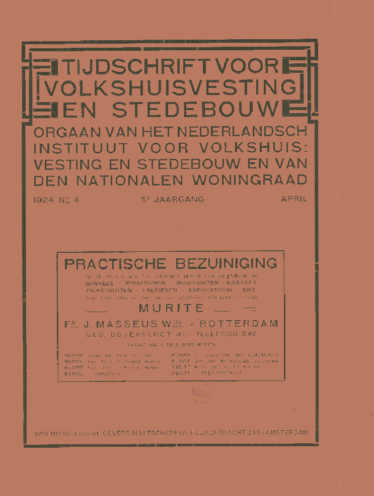 SITIJDSCHRIFTVOORERIVOLKSHUISVESTINGIEN STEDEBOUWEJORGAAN VAN HET NEDERLANDSCHINSTITUUT VOOR VOLKSHUIS:VESTING EN STEDEBOUW EN VANDEN NATIONALEN WONINGRAAD1924 N? 4 5' JAARGANG APRILPRACTISCHE BEZUINIGINGop de kosten van het bekleeden van muren en plafonds inWINKELS - MAQAZIJNEN - WOONHUIZEN - GARAGESZIEKENHUIZEN - FABRiEKEN - LABORATORiA - ENZ.door toepassing van ons nieuwe bepleisteringsmateriaalMURITEFA. J. MASSEUS WIN. - ROTTERDAMGED. BOTERSLOOT 119 - TELEFOON 3186^^m VRAAGT ONS BOEKJE OVER MURITEMURITE wordt zoo hard als steenMURITE kan direct beschilderd wordenMURITE kan direct behangen wordenMURITE is afwasclibaarMURITE is hygignischor dan tegelbekleedingMURITE geeft een NAADLOOZE oppervlakteMURITE krimpt niet en zet niet uitMURITE is ZEER GOEDKOOPijVAN MUNSTER'S UITGEVERS MAATSCHAPPIJ - HEERENGRACHT 246 - AMSTERDAMVAN OMMEREN & Co.PAUWSTRAAT - ARNHEMHi^^M TELEFOON 800 _??SPIEGEL-, VENSTERGLAS. VERF-WAREN, GESLEPEN GLAS ZOOWELBLANK ALS VERZILVERDSPECIAAL VOORMEUBiELMAKERS EN CAROSSERIE-FABRIKANTENajwiaiiiariuaiaiaBniaiaii^^CABOTINEHOUTBEDERFWERENDE CREOSOOT-OUEBEITSEN-VERF IN ALLE KLEURENHet beste ter wereld en alleendan echt en gegarandeerd, wan-neer emballage gezegeld B. & Co.levert billijk de Fa. BUDDING & Co.CORN. TROOSTSTRAAT 59 - AMSTERDAMTelefoon 25287[i!LIJNBAAN 47 TELEFOON 990DORDRECHTLevert U ALLE soorten GLAS voor de BOUW-BEDRIJVEN tegen uiterst concurrente prijzen.SpeciaKteit in fijne LAKKEN en VERNISSEN.AUeenverkoop voor DORDRECHT en Omstrekenvan de beroemde VELUVINEVERVEN.-- VRAAGT PRIJS --A. PEETERS & C^.BELAGECGEWiPYTHAGORASSTRAAT 1AMSTERDAM - TEL. 223938T ZICH MET HET UITVOEREN VANOMBINEERDEN WERKEN,APEND EN ONGEWAPEND BETONPTM Oni IXAAA/B-Dk-ITMKN, V. Behangers-Fournituren-MaatschappijJ. OFTENAmsterdam, Singei 68Telefoon 35685 en 45234Na 6 uur No. 27630Filiaal: R otter d amSchiekade 182Telefoon 11208nr'feSpecialiteit ID Mum-, Stoifeerder!;- en Meubelmakers-MateriaalRaamgarnituren - Catalogus op aanvrageSCHELPKALKGEBRUIKT SCHELPKALK, EEN PRIMA MATERIAALEEN BIJ UITSTEK NEDERLANDSCH PRODUCTVereeniging van Ncderlandschc SchelpkalkfabrikaiitenAPOTHEKERSDIJK 34 LEIDENBETONWONINGBOUW:: VOLGENS BRONS PATENTEN ::Een uitkomst voor de Woning-voorziening. Goedkooper enbeter dan Baksteenbouw - Aesthetisch verzorgd Vraagt inlichtingen ook omtrent uitgevoerde Woningcomplexen bij de N. V. BOUWIVIAATSCHAPPIJ JJ..OCCIDENT" te AMSTERDAM, Joh. Verhulststraat 156a, Telefoon 23506 - 20516 - 26851 SSnmTWENM SCI[LPKmND[llllte ALKMAAR ELEVERT PRIMA JSCHELPKALK Z U TEGEN CONCURREERENDE PRIJS PER SPOOR EN PERSCHIP S Kantoor: HOUTWEG 19 - ALKMAAR ?fi?fi?iyitfiyiyi?i?i?ifiyiyiyi!fi?fi?iyi?i?iKtfimHiJJJJ KUNSTGRUmnVLDEREH, m-RECHIBLADtN melN. I[LLING - Kaotoor 1. P. Heyeslraat 109Concurreerende pfijzen WERKPLIlllTS OV[RTOOM 209 Vtaaot monsteis!Jfi\?mHiVAN HEEST & ZONENZUIVERAARSmm VOOR mriGEN: MUHNIXSTRIIIT 101 -- AMSIERDAM?fiifiyitfi!iiyiyi!fiifiyiyiifi?yi!fibfiyitfiyiyiyiyiWij zuiveren uwe woningen met eenVLOEIBAAR MIDDEL,(lat zorgvuldigin alle naden gewerkt wordt endoor zijn eigenschappen in murenen lioutweric doortrekt, waardoor nietalleen liet 11^ S E C T maar ooi( deNETEN VERNIETIGD worden.SCHITTERENDE REFERENTIEN!!!IIliritlS MLlJLmb OL L". ni[R?iino3- MQoni^^^EAULEDEN ! ONZ E AD VERTEERDERS ZIJN EEN STEUN VOOR ONS - LATEN WIJ EEN STEUN VOOR HEN ZIJNELECTRICITEIT OP ELK GEBIEDB.C.TELEFOON -- ELECTRISCHE SCHELLENLIGHT -- KRACHT -- VERWARMINGiiiiMiiiiiiiiiiiiiijiiiiiiiiiiiiiiiiiiiiiiiinitiiiiiiiiiNiiiiiiiiiiiiiiiiiiiimiiiiiDiiiiniiiiiiiiiiiiiiiiiiiiiiiiiiiiiiiiii- N. Z. KOLK11 - MOON 48181 -J. DE WOLFF - UTRECHT. ELECTRO=TECHNISCH BUREAUELECTRICITEIT OP ELK GEBIEDBILDERDIJKSTRAAT 57 -- TELEFOON 1761C-K^KX^K-C-KC-K-2-^KOK^K^K^XA. D. E. JERPHANIONAdmiraal de Ruyterweg 1871, AmsterdamTelefoon Zuid 8761HANDEL IN BLAUWE PLINTSTEEN,GELE-en PAARSCHE VOORGEVELSTEEN,PROFIL- EN V E R B L E NDSTEEN,VUURVAST MATERIAAL-SEPTIC-TANCS, BETONRIOLEN, PANNEN ENZ.rrmK*K'>K*K*K->K**K-]-::*->Kx'oningbouw, -- -- waarop gccn zvi/aar verkeer is tc verwachten tegen zeer lagen prijs -- --IBBBBBIBaBHaHBBHHHBBaBASMAN & SABELSON - Bouwkundigen en AannemersKANTOOR: HOOGEWEG 48 EN 50 - TEL. 24752ELECTRiSCHE TIMMERFABRIEK J. L. ASIVIAN - MAKELAARVISSCHERSPAD 4 LINNAEUSKADE 17 - AlViSTERDAIVI- TEL. 23989H. J.BIJZONDERIN! VOORT HOL -GROOTE LOKALENH u is-SPECIAAL- en DecoraIN SPATWERKtiesch 1 IderVAN OSTADESTRAAT 300-- TELEFOON 27553 -- AlViSTERDAIVI,PRIMA SLAV. EIKEN EN BEUKENPARKETVLOERENTEGEN UITERSTCONCURREERENDEPRIJZEN ONDER GARANTIEFRED. MEIJER - AMSTERDAMV. BAERLESTRAAT 160, TELEF. 25615GEVESTIGD SEDERT 19081C. REITH Jr.Amsterdam - Marnixstraat 76Telef.45797Aannemer vanLood-, Zink- en RioleeringwerkenyilllllllllllllllllllillllllimiiUllilllf HJIIillilligiillllllllllllllllllillllllllllllllllillllllllllllEI i Firma ROOZETUIJL - Zuiveraars IS EX AMBTENAREN BIJ DEN GEMEENTELIJKENGEZONDHEIDSDIENST ~S: Speciaal in het verdelgen van Wandluizen, Kakker- ZS-- lakken, Crijniuis etc. volgens nieuw systeem met ^~ de nieuwste apparaten en vindingen, waardoor ZZ^ succes gewaarborgd is --~ H.H. Huiseigenaren voordeelige contracten ^I l(antoo[:imfillllI26UMSI[llOi - Ielefoon295H |~ ALLE WERKZAAMHEDEN WORDEN ONDER GARANTIE UITGEVOERD ZI!:iiiiiiMiiiniiMiiiiiiiiiiiiiiiiiirmTif: imiiiiiiiiiiiiiiimmiiimiiimmmiiiiiimiiiiiiiiiEJ. D O T 1 N GSTUCAbOORrEGElZEIIEII[lllllLEVOORtOMEIID[B[IOMEIIKEIIJACOB VAN CAMPENSTRAAT 121AlViSTERDAIVI - TELEFOON 28243IVTROTTOIR "'' VIGOROSE CEMENT INDUSTRIE RONDEXOVALEMLSJiDEII ?\^^2^??" RIOLENTELEFOON 205BETON PALEN -EIGEN SPOORAANSLUITING- TUINMURENPRODUCTIE 1000 M^. TEGELS PER DAGPNEUMATISCHE STAMPINRICHTING -- P ERSO NE EL 100 ARBEI D ERSGEMAAKTVANGEKLOOFDHOUTTREKKENENKRIMPENNIETIS DEBINNENDEUR voor den HandelCONCURREEREND van f 5.50 tot f 6.50Timmerfabriek ,,De Drie Gebroeders" - SCHMIDT & CoBUSSUMFABRIEKrROEMER VISSCHERLAAN 10KANTOOR:LAMMERT MAJOORLAAN 40 - TEL. 492LOON-ZAGERIJ en-SCHAVERIJ - I.SPETTERRuyschstraat 83-83^ - AMSTERDAM - Telefoon 52885, na vijf uur 24017OP DIT GEBIED OUDSTE FIRIVIA TE DEZER