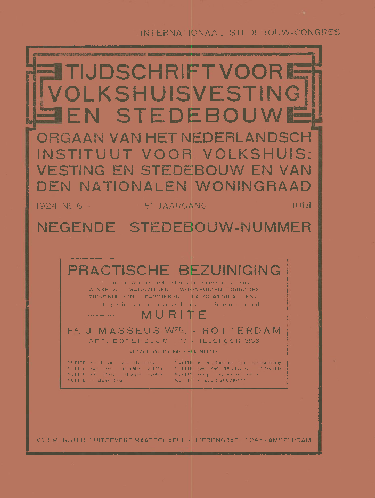 INTERNATIONAAL STEDEBOUW-CONGRESaTIJDSCHRIFTVOORVOLKSHUISVESTINGEN STEDEBOUWORGAAN VAN HET NEDERLANDSCHINSTITUUT VOOR VOLKSHUIS:VESTING EN STEDEBOUW EN VANDEN NATIONALEN WONINGRAAD1924 N2 6NEGENDE STEDEBOUW-NUMMER5' JAARGANG JUNIPRACTISCHE BEZUINIGINGop de kosten van het bekleeden van muren en plafonds inWINKELS - MAGAZiJNEN - WOONHUIZEN - GARAGESZIEKENHUIZEN - FABRIEKEN - LABORATORIA - ENZ.door toepassing van ons nieuwe bepi eisteringsmateriaalMURITEFA. J. MASSEUS Wm. - ROTTERDAMGED. BOTERSLOOT 119 - TELEFQON 3186VRAACiT ONS BOEKJE OVER MURITEMURITE wordi zoo hard als steenMURITE kan direct beschilderd wordenMURITE kan [direct behangen wordenMURITE is afwaschbaarMURITE is hygiSnischer dan tegelbekleedingMURITE geeft een NAADLOOZE oppervlakteMURITE krimpt niet en zet niet uitMURITE is ZEER GOEDKOOPVAN MUNSTER'S UiTGEVERS MAATSCHAPPiJ - HEERENGRACHT 246 - AMSTERDAMVAN OMMEREN & Co.PAUWSTRAAT - ARNHEMMMM^ TELEFOON 800 I^^MMHISPIEGEL-, VENSTERGLAS. VERF-WAREN, GESLEPEN GLAS ZOOWELBLANK ALS VERZILVERDSPECIAAL VOORMEUBELMAKER8 EN CAR0S8ERI E-FAB Rl KANTE NCABOTINEHOUTBEDERFWERENDE CREOSOOT-OUEBEITSEN-VERF IN ALLE KLEUR|ENHet beste ter wereld en alleendan echt en gegarandeerd, vcan-neer emballage gezegeld B. & Co.levert biUijk de Fa. BUDDING & Co.CORN. TROOSTSTRAAT 59 - AMSTERDAMTelefoon 23287De DORDD GLAS en VHLIJNBAAN 47 TELEFOON 990DORDRECHTLevert U ALLE soorten GLAS voor de BOUW-BEDRIJVEN tegen uiterst concurrente prijzen.SpedaHteit in fijne LAKKEN en VERNISSEN.AUeenverkoop voor DORDRECHT en Omstrekenvan de beroemde VE L U V I N E VE R VE N.-- VRAAGT PRIIS --FIRMA W[D. M. Vim iURS - SCHIEDAMNIEUWE HAVEN 9 - Werkplaats: BROERSVELD 71 - Tel. 879LOOD- EN ZINKWERKERIJmiNLEG VOOR GAS- EN WATERLEIOING, LEIEN- EN MASTIEX DAK6EDEKKINGHOUTHANDEL - S.BLANKERTLINDENGRACHT 258-260 - AMSTERDAM - TELEFOON 44475CONCURREEREND ADRES, OOK VOOR TRIPLEXN. V. Behangers-Fournituren-MaatschappijJ. OFTENAmsterdam, Singel 68Telefoon 35685 en 45234N a 6 u u r No. 27630Filiaal: RotterdamSchiekade 182Telefoon 11208n TSpecialiteit in Behangers-, Stoffeerders- en Meubelmakers-MateriaalRaamgarnlturen - Catalogus op aanvrageN. V. ?De Vlan)ovefl!;traatl(liiiker? ZeistDRIEBERGSCHEWEG 6 TELEFOON 503: METSELSTEENEN VOOR ALLE BOUWWERKEN!!! ! met bijlevering van zachte steenen voor binnenmuren en fundeeringen tegen verminderden prijs. STRAATKLINKERS - TROTTOIRKLINKERS - VLOERKLINKERS Beschikbaar voor directe levering groote partijen voor straten bij woningbouw, Jl -- -- waarop gecn zwaar verkeer is te vcrwachten tegen zecr lagen prijs -- -- !BETONWONINGBOUW:: VOLGENS BRONS PATENTEN ::? Een uitkomst voor de Woning-voorziening. Goedkooper en beter dan Baksteenbouw - Aesthetisch verzorgd "S Vraagt inlichtingen ook omtrent uitgevoerde Woningcomplexen biJ de N. V. BOUWMAATSCHAPPIJ "SS ..OCCIDENT" te AMSTERDAIVI, Joh. Verhulststraat 156a, Telefoon 23506 - 20516 - 26851 SS _, iB?aH?PR I MA SLAV. El KEN EN BEUKENPARKETVLOERENTEGEN UITERSTCONCURREERENDEPRIJZEN ONDER GARANTIEFRED. MEIJER - AMSTERDAMV. BAERLESTRAAT 160, TELEF. 25615GEVESTIGD SEDERjT 1908VAN HEEST & ZONENZUIVERAARSBUeU VOOR imG[N: MARNIXSIRAIIT101 - AMSTERDAMWij zuiveren uwe woningen met eenVLOEIBAAR MIDDEL.datzorgvuldigin alle naden gewerkt wordt endoor zijn eigenschappen in murenen houtwerl( doortrelct, waardoor nietalleen het INSECT maar ooi( deNETEN VERNIETIGD worden.SCHITTERENDE REFERENTIEN!!!ZUID-HOLLANDSCHE WAGENFABRIEK ENCONSTRUCTIEWERKPLAATSP. KRAAIJEVELDLOOSDUINSCHE WEG 623 - DEN HAAG - TELEF. IVI. 1489A LL E S OP HET GEBIED VAN WAGENBOUW-EN IJZERCONSTRUCTI^NLEVERT AAN VERSCHILLENDE RIJKS- EN GEM. INSTELLINGENIIT R O T T OI R J^c^T^^TM^^^ RONDEXOVALElElSJJiEN ^^o."!^!^.??" RIOLENTELEFOON 205BETON PALEN -EIGEN SPOORAANSLUITING- TUINMURENPRODUCTIE 1000 M^. TEGELS PER DAGPNEUMATISCHE S TA M P I N R I C H T I N G -- PERSONEEL 100 ARBEIDERSGEMAAKTVANGEKLOOFDHOUTARISTOS DEUR NTREKKENENKRIMPENNIETIS DEBINNENDEUR voor den HandelCONCURREEREND van f 5.50 tot f 6.50Timmerfabriek ,,De Drie Gebroeders" - SCHMIDT & Co.FABRIEK:ROEMER VISSCHERLAAN 10 BUSSUM KANTOOR:LAMMERT MAJOORLAAN 40 - TEL. 492LOON-ZAGERIJ en -SCHAVERIJ - I.SPETTERRuyschstraat 83-83^ - AMSTERDAM - Telefoon 52885, na vijf uur 24017OP DIT GEBIED OUDSTE FIRMA TE DEZER STEDEDE RUITER & MAASWINKEL VAN OSTADESTRAAT 115 -- TEL. 27174AMSTERDAMAANNEMERS VAN SCHILDERWERKENBETONBOUWONDERNEMINGJ. VAN BAARSEN & H. L. STRUBEKROMME WAAL 29 TELEF. 41377 AMSTERDAMKONING & BIENFAIT - Da Costakade 104AMSTERDAMOnderzoek van alle materialen voor den VOLKSWONINGBOUWMAANDBLAD 5E JAARGANO N?- 6 15 JUNI 1924TIJDSCHRIFT VOOR VOLKSHUISVESTINGiiiiiiiiiiiiiiiiiiiiiiiiiiiiiiiiiiiiiiiiiiiiiiiiiiiiiiiiiiiiiiiiiiiiiiiiiiiiiiiiiiiiiiiiiiiiiiiiiiiiiiiiiiiiiiiiiiiiiiii EN STEDEBOUW iiiiiiiiiiiiiiiiiiiiiiiiiiiiiiiiiiiiiiiiiiiiiiiiiiiiiiiiiiiiORGAAN VAN HET NEDERLANDSCH INSTITUUT VOOR VOLKSHUIS-VESTING EN STEDEBOUW EN DEN NATIONALEN WONINGRAADNEQENDE STEDEBOU W-N UMMERREDACTIE VOOR HET INSTITUUTH. P. J. BLOEMERS, J. DOUWES JR.,MR. D. HUDIG, IR. P. BARKER SCHUT,IR. J. M. A. ZOETMULDERVASTE MEDEWERKERS : J. W. BOSSENBROEK,G. A. M. DE BRUYN, IR. A. KEPPLER, MR.J. KRUSEMAN, IR. A. M. KUYSTEN, JHR.A. H. OP TEN NOORT, JAN STUYT,M. VRIJENHOEK, L. VAN DER WAL, D.E. WENTINKREDACTIE VOOR DEN WONINGRAAD :MR. G. VAN DEN BERGH EN J. BOMMERADRES DER REDACTIEEN ADMINISTRATIE ENSECRETARIAAT VAN HETINSTITUUT EN VAN DENNATIONALEN WONINGRAADKLOVENIERSBUHGWAL 70 - AMSTERDAMADVERTENTIESV. MUNSTER'S UITGEVERS MAATSCHAPPIJHEERENGRACHT 246 - AMSTERDAMABONNEMENTSPRIJSDELEDEN VAN HET NEDERLANDSCH INSTITUUTVOOR VOLKSHUISVESTING EN STEDEBOUW(LIDMAATSCHAP VOOR PHYSIEKELEDEN fy.go)EN DE LEDEN VAN DEN NATIONALENWONINGRAAD ONTVANGEN HET BLADKOSTELOOSLOSSE NUMMERS f 1.50INHOUD: NED. INSTITUUT VOOR VOLKSHUISVESTING EN STEDEBOUW:Officieele Mededeelingen - De prae-adviezen voor het Internationaal Stedebouwcongres door P. BakkerSchut, H.; H. Cleyndert Azn. - Binnenland - Overzicht van tijdschriften.NATIONALS WONINGRAAD : Officieele Mededeelingen - Huurverlaging door J. - Verkoop va