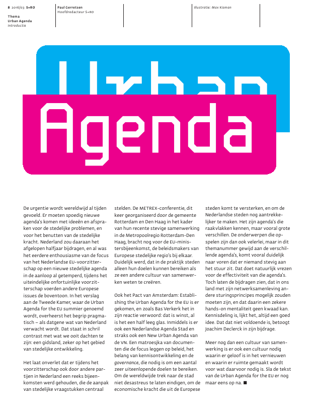 8 2016/03 S+ROThemaUrban AgendaIntroductiePaul GerretsenHoofdredacteur S+ROIllustratie: Max KismanDe urgentie wordt wereldwijd al tijdengevoeld. Er moeten spoedig nieuweagenda's komen met idee?n en afspra-ken voor de stedelijke problemen, envoor het benutten van de stedelijkekracht. Nederland zou daaraan hetafgelopen halfjaar bijdragen, en al washet eerdere enthousiasme van de focusvan het Nederlandse EU-voorzitter-schap op een nieuwe stedelijke agendain de aanloop al getemperd, tijdens hetuiteindelijke onfortuinlijke voorzit-terschap voerden andere Europeseissues de boventoon. In het verslagaan de Tweede Kamer, waar de UrbanAgenda for the EU summier genoemdwordt, overheerst het begrip pragma-tisch ? als datgene wat van Nederlandverwacht wordt. Dat staat in schrilcontrast met wat we ooit dachten tezijn: een gidsland, zeker op het gebiedvan stedelijke ontwikkeling.Het laat onverlet dat er tijdens hetvoorzitterschap ook door andere par-tijen in Nederland een reeks bijeen-komsten werd gehouden, die de aanpakvan stedelijke vraagstukken centraalstelden. De METREX-conferentie, ditkeer georganiseerd door de gemeenteRotterdam en Den Haag in het kadervan hun recente stevige samenwerkingin de Metropoolregio Rotterdam-DenHaag, bracht nog voor de EU-minis-tersbijeenkomst, de beleidsmakers vanEuropese stedelijke regio's bij elkaar.Duidelijk werd, dat in de praktijk stedenalleen hun doelen kunnen bereiken alsze een andere cultuur van samenwer-ken weten te cre?ren.Ook het Pact van Amsterdam: Establi-shing the Urban Agenda for the EU is ergekomen, en zoals Bas Verkerk het inzijn reactie verwoord: dat is winst, alis het een half leeg glas. Inmiddels is erook een Nederlandse Agenda Stad enstraks ook een New Urban Agenda vande VN. Een matroesjka van documen-ten die de focus leggen op beleid, hetbelang van kennisontwikkeling en degovernance, die nodig is om een aantalzeer uiteenlopende doelen te bereiken.Om de wereldwijde trek naar de stadniet desastreus te laten eindigen, om deeconomische kracht die uit de Europesesteden komt te versterken, en om deNederlandse steden nog aantrekke-lijker te maken. Het zijn agenda's dieraakvlakken kennen, maar vooral groteverschillen. De onderwerpen die op-spelen zijn dan ook velerlei, maar in ditthemanummer gewijd aan de verschil-lende agenda's, komt vooral duidelijknaar voren dat er niemand stevig aanhet stuur zit. Dat doet natuurlijk vrezenvoor de effectiviteit van die agenda's.Toch laten de bijdragen zien, dat in onsland met zijn netwerksamenleving an-dere sturingsprincipes mogelijk zoudenmoeten zijn, en dat daarin een zekerehands-on mentaliteit geen kwaad kan.Kennisdeling is, lijkt het, altijd een goedidee. Dat dat niet voldoende is, betoogtJoachim Declerck in zijn bijdrage.Meer nog dan een cultuur van samen-werking is er ook een cultuur nodigwaarin er geloof is in het vernieuwenen waarin er ruimte gemaakt wordtvoor wat daarvoor nodig is. Sla de tekstvan de Urban Agenda for the EU er nogmaar eens op na. UrbanAgenda