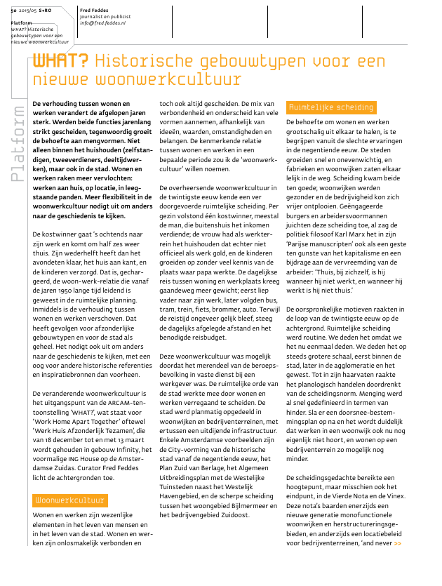 PlatformDe verhouding tussen wonen enwerken verandert de afgelopen jarensterk. Werden beide functies jarenlangstrikt gescheiden, tegenwoordig groeitde behoefte aan mengvormen. Nietalleen binnen het huishouden (zelfstan-digen, tweeverdieners, deeltijdwer-ken), maar ook in de stad. Wonen enwerken raken meer vervlochten:werken aan huis, op locatie, in leeg-staande panden. Meer flexibiliteit in dewoonwerkcultuur nodigt uit om andersnaar de geschiedenis te kijken.De kostwinner gaat 's ochtends naarzijn werk en komt om half zes weerthuis. Zijn wederhelft heeft dan hetavondeten klaar, het huis aan kant, ende kinderen verzorgd. Dat is, gechar-geerd, de woon-werk-relatie die vanafde jaren 1950 lange tijd leidend isgeweest in de ruimtelijke planning.Inmiddels is de verhouding tussenwonen en werken verschoven. Datheeft gevolgen voor afzonderlijkegebouwtypen en voor de stad alsgeheel. Het nodigt ook uit om andersnaar de geschiedenis te kijken, met eenoog voor andere historische referentiesen inspiratiebronnen dan voorheen.De veranderende woonwerkcultuur ishet uitgangspunt van de ARCAM-ten-toonstelling `WHAT?', wat staat voor`Work Home Apart Together' oftewel`Werk Huis Afzonderlijk Tezamen', dievan 18 december tot en met 13 maartwordt gehouden in gebouw Infinity, hetvoormalige ING House op de Amster-damse Zuidas. Curator Fred Feddeslicht de achtergronden toe.WoonwerkcultuurWonen en werken zijn wezenlijkeelementen in het leven van mensen enin het leven van de stad. Wonen en wer-ken zijn onlosmakelijk verbonden entoch ook altijd gescheiden. De mix vanverbondenheid en onderscheid kan velevormen aannemen, afhankelijk vanidee?n, waarden, omstandigheden enbelangen. De kenmerkende relatietussen wonen en werken in eenbepaalde periode zou ik de `woonwerk-cultuur' willen noemen.De overheersende woonwerkcultuur inde twintigste eeuw kende een verdoorgevoerde ruimtelijke scheiding. Pergezin volstond ??n kostwinner, meestalde man, die buitenshuis het inkomenverdiende; de vrouw had als werkter-rein het huishouden dat echter nietofficieel als werk gold, en de kinderengroeiden op zonder veel kennis van deplaats waar papa werkte. De dagelijksereis tussen woning en werkplaats kreeggaandeweg meer gewicht; eerst liepvader naar zijn werk, later volgden bus,tram, trein, fiets, brommer, auto. Terwijlde reistijd ongeveer gelijk bleef, steegde dagelijks afgelegde afstand en hetbenodigde reisbudget.Deze woonwerkcultuur was mogelijkdoordat het merendeel van de beroeps-bevolking in vaste dienst bij eenwerkgever was. De ruimtelijke orde vande stad werkte mee door wonen enwerken verregaand te scheiden. Destad werd planmatig opgedeeld inwoonwijken en bedrijventerreinen, metertussen een uitdijende infrastructuur.Enkele Amsterdamse voorbeelden zijnde City-vorming van de historischestad vanaf de negentiende eeuw, hetPlan Zuid van Berlage, het AlgemeenUitbreidingsplan met de WestelijkeTuinsteden naast het WestelijkHavengebied, en de scherpe scheidingtussen het woongebied Bijlmermeer enhet bedrijvengebied Zuidoost.Ruimtelijke scheidingDe behoefte om wonen en werkengrootschalig uit elkaar te halen, is tebegrijpen vanuit de slechte ervaringenin de negentiende eeuw. De stedengroeiden snel en onevenwichtig, enfabrieken en woonwijken zaten elkaarlelijk in de weg. Scheiding kwam beideten goede; woonwijken werdengezonder en de bedrijvigheid kon zichvrijer ontplooien. Ge?ngageerdeburgers en arbeidersvoormannenjuichten deze scheiding toe, al zag depolitiek filosoof Karl Marx het in zijn`Parijse manuscripten' ook als een gesteten gunste van het kapitalisme en eenbijdrage aan de vervreemding van dearbeider: `Thuis, bij zichzelf, is hijwanneer hij niet werkt, en wanneer hijwerkt is hij niet thuis.'De oorspronkelijke motieven raakten inde loop van de twintigste eeuw op deachtergrond. Ruimtelijke scheidingwerd routine. We deden het omdat wehet nu eenmaal deden. We deden het opsteeds grotere schaal, eerst binnen destad, later in de agglomeratie en hetgewest. Tot in zijn haarvaten raaktehet planologisch handelen doordrenktvan de scheidingsnorm. Menging werdal snel gedefinieerd in termen vanhinder. Sla er een doorsnee-bestem-mingsplan op na en het wordt duidelijkdat werken in een woonwijk ook nu nogeigenlijk niet hoort, en wonen op eenbedrijventerrein zo mogelijk nogminder.De scheidingsgedachte bereikte eenhoogtepunt, maar misschien ook heteindpunt, in de Vierde Nota en de Vinex.Deze nota's baarden enerzijds eennieuwe generatie monofunctionelewoonwijken en herstructureringsge-bieden, en anderzijds een locatiebeleidvoor bedrijventerreinen, `and never >>WHAT? Historische gebouwtypen voor eennieuwe woonwerkcultuur50 2015/05 S+ROPlatformWHAT? Historischegebouwtypen voor eennieuwe woonwerkcultuurFred FeddesJournalist en publicistinfo@fred.feddes.nlPlatformWHAT?De tentoonstelling `WHAT? Work, Home, Apart,Together', vindt plaats op een unieke locatie: de bo-venste etage van het gebouw Infinity, het voorma-lige ING House aan de Amsterdamse Zuidas.De tentoonstelling is samengesteld door ArcamArchitectuurcentrum Amsterdam en Fred Feddes,auteur van `1000 jaar Amsterdam'. Looptijd: 18december 2015 tot en met 13 maart 2016. Openings-tijden: donderdag tot en met zaterdag, 11.00-17.00uur (16.00 uur laatste toegang). Locatie: Infinity,Amstelveenseweg 500, 1081 KL Amsterdam. Meerinfo: http://www.arcam.nl/what/Onder: Winkelwoningen warenwijdverbreid in de tijd datmiddenstanders nog bij hun neringwoonden. Dit bouwblok in deRuyschstraat, ontworpen door J.Redelaar in 1903 voor `MaatschappijHet Resultaat', laat een flexibeleindeling zien, met om en om eenwinkelwoning en een gewonebenedenwoning. Bron: StadsarchiefAmsterdamBoven: Dienstwoningen waren ooiteen vanzelfsprekend onderdeelvan grote bouwplannen. Zoals depastorie bij de R.K. Parochiale Kerkvan de Heilige Maria Magdalena in deSpaarndammerbuurt in Amsterdam,ontworpen door Pierre Cuypers in1889. Bron: Stadsarchief AmsterdamS+RO 2015/05 51PlatformWHAT? Historischegebouwtypen voor eennieuwe woonwerkcultuurthe twain shall m