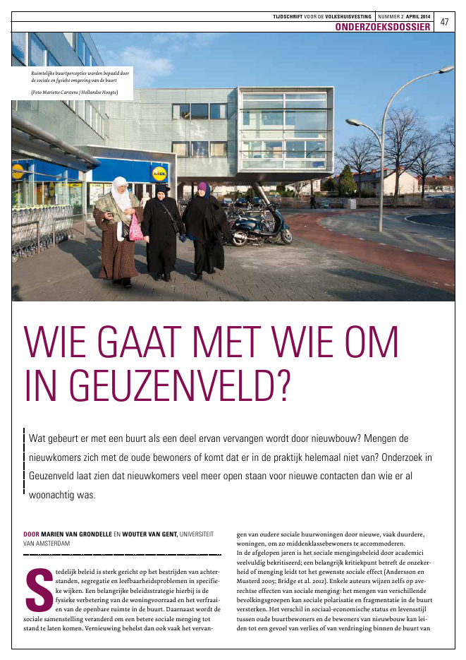 47TIJDSCHRIFT VOOR DE VOLKSHUISVESTING NUMMER 2 APRIL 2014ONDERZOEKSDOSSIERDOOR MARIEN VAN GRONDELLE EN WOUTER VAN GENT, UNIVERSITEITVAN AMSTERDAMStedelijk beleid is sterk gericht op het bestrijden van achter-standen, segregatie en leefbaarheidsproblemen in specifie-ke wijken. Een belangrijke beleidsstrategie hierbij is defysieke verbetering van de woningvoorraad en het verfraai-en van de openbare ruimte in de buurt. Daarnaast wordt desociale samenstelling veranderd om een betere sociale menging totstand te laten komen. Vernieuwing behelst dan ook vaak het vervan-gen van oudere sociale huurwoningen door nieuwe, vaak duurdere,woningen, om zo middenklassebewoners te accommoderen.In de afgelopen jaren is het sociale mengingsbeleid door academiciveelvuldig bekritiseerd; een belangrijk kritiekpunt betreft de onzeker-heid of menging leidt tot het gewenste sociale effect (Andersson enMusterd 2005; Bridge et al. 2012). Enkele auteurs wijzen zelfs op ave-rechtse effecten van sociale menging: het mengen van verschillendebevolkingsgroepen kan sociale polarisatie en fragmentatie in de buurtversterken. Het verschil in sociaal-economische status en levensstijltussen oude buurtbewoners en de bewoners van nieuwbouw kan lei-den tot een gevoel van verlies of van verdringing binnen de buurt vanWIE GAAT MET WIE OMIN GEUZENVELD?Wat gebeurt er met een buurt als een deel ervan vervangen wordt door nieuwbouw? Mengen denieuwkomers zich met de oude bewoners of komt dat er in de praktijk helemaal niet van? Onderzoek inGeuzenveld laat zien dat nieuwkomers veel meer open staan voor nieuwe contacten dan wie er alwoonachtig was.Ruimtelijkebuurtperceptieswordenbepaalddoordesocialeenfysiekeomgevingvandebuurt(FotoMarietteCarstens/HollandseHoogte)48ONDERZOEKSDOSSIERTIJDSCHRIFT VOOR DE VOLKSHUISVESTING NUMMER 2 APRIL 2014de oude bewoners, die hun buurt fysiek en sociaal hebben zien veran-deren (Davidson en Lees 2005; Bridge c.s. 2012, Watt 2006). Bovendienkunnen nieuwe bewoners zich sociaal distanti?ren van de buurt.Hoewel idealistisch ingestelde middenklassebewoners breed contac-ten kunnen aangaan (Veldboer, 2010), wijst ander onderzoek op `disaf-filiatie' bij de middenklasse. `Disaffiliatie' verwijst naar de keuze omgeen sociale bindingen aan te gaan in de buurt.1De aanname is dat demiddenklasse, meer dan andere groepen, de mogelijkheden heeft omdeze keuze te kunnen maken. Pinkster (2013) stelt in een studie naarmiddenklassebewoners in armere buurten dat het contact tussentypen bewoners gering is. Een groot deel van de middenklassebewo-ners brengt weinig tijd door in hun buurt, heeft elders vrienden enwinkelt niet in de buurt. De buurtkeuze is voornamelijk ingegevendoor de gunstige prijs-kwaliteitverhouding van de woningen. De bin-ding met de buurt is zeer gering en de buurt wordt soms bewust ver-meden (Pinkster 2014).Hoewel we al enige inzicht hebben in disaffiliatieprocessen waarbijhet scherp aangeven van symbolische grenzen een belangrijke rol spe-len (Pinkster 2013, Van Eijk 2011), is het onbekend of en hoe deze pro-cessen een ruimtelijk manifestatie kennen (zie Lawton 2013). Kortom,hoewel theorie en eerder onderzoek wijzen op de mogelijkheid vanprocessen van disaffiliatie bij zowel nieuwkomers als bij reeds geves-tigde bewoners, is het onbekend of dit zich vertaalt in ruimtelijkebuurtpercepties, wat gefragmenteerde buurten tot gevolg zou hebben.De hoofdvraag van deze paper luidt: hoe verhouden ruimtelijke buurt-percepties van bewoners in verschillende delen van Geuzenveld zichtot elkaar, en in hoeverre hangen ruimtelijke percepties samen met dehouding tegenover de buurt en andere buurtbewoners?De vraag wordt beantwoord aan de hand van een analyse van de her-structureringswijk Geuzenveld, in Amsterdam. De studie richt zich opde ruimtelijke buurtpercepties van bewoners in verschillende delenvan de buurt. Door middel van een enqu?te zijn bewoners in verschil-lende deelgebieden gevraagd naar hun houding tegenover buren en debuurt. Daarnaast is gevraagd hun eigen buurt op een kaart te begren-zen. De aanname is dat bewoners binnen de administratieve definitiesieder een eigen omgeving aanduiden waarin zij wonen en waar zijsociale betekenis aan geven. Daarnaast is de aanname dat delen dieniet getekend worden geen of minder buurtbinding wordt toegekend.Dit wijst op disaffiliatie maar niet noodzakelijk op conflict of afwij-zing. Voor analyse zijn deze getekende kaarten verwerkt met ArcGIS.Deze analysemethode is relatief nieuw binnen het hierboven geschets-te debat.Alvorens de onderzoeksopzet en resultaten te bespreken zal eerst hetconcept `ruimtelijke buurtpercepties' worden toegelicht. Dit stukwordt afgesloten met een terugkoppeling naar de discussie over men-ging en de bruikbaarheid van de methode voor beleidsevaluatie.RUIMTELIJKE BUURTPERCEPTIESRuimtelijke buurtpercepties worden bepaald door de sociale en fysiekeomgeving van de buurt. Hoewel buurtpercepties verbonden zijn metde administratieve grenzen en de fysieke omgeving van de buurt(infrastructuur, parken, water, etc.), worden percepties binnen eenbuurt vooral gecre?erd door verschillende sociale processen.Dergelijke ruimtelijke percepties ontstaan doordat mensen socialecategorisaties aanbrengen aan mensen, objecten, handelen, plekkenen tijdperioden die ons helpen de wereld om ons heen te begrijpen(Lamont & Moln?r 2002; Van Eijk 2011).Dit conceptueel onderscheid kan ook gemaakt worden in de ruimtelij-ke omgeving zoals `wij wonen in deze buurt', `dit is een goed gedeeltevan de buurt' of `daar achter, dat is een slechte buurt' (zie Evans 1980).Deze sociale categorisaties die van invloed zijn op de perceptie vanmensen worden ook wel symbolische scheidslijnen genoemd en kun-nen in negatieve zin leiden tot meer onbegrip, intolerantie, en wij-zijdenken. Dat kan de sociale harmonie in een gemengde wijk sterk ver-storen.Volgens Van Eijk (2011) zijn vooral symbolische scheidslijnen ingemengde buurten van belang. Echter, op een lager schaalniveau kun-nen binnen gemengde wijken w
