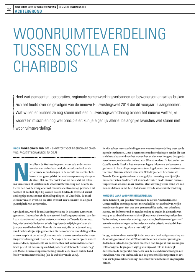 22ACHTERGRONDTIJDSCHRIFT VOOR DE VOLKSHUISVESTING NUMMER 6 DECEMBER 2014WOONRUIMTEVERDELINGTUSSEN SCYLLA ENCHARIBDISHeel wat gemeenten, corporaties, regionale samenwerkingsverbanden en bewonersorganisaties brekenzich het hoofd over de gevolgen van de nieuwe Huisvestingswet 2014 die dit voorjaar is aangenomen.Wat willen en kunnen ze nog sturen met een huisvestingsverordening binnen het nieuwe wettelijkekader? En misschien nog wel principi?ler: kun je eigenlijk allerlei belangrijke kwesties wel sturen metwoonruimteverdeling?DOOR ANDR? OUWEHAND, OTB ? ONDERZOEK VOOR DE GEBOUWDE OMGE-VING, FACULTEIT BOUWKUNDE, TU DELFTNiet alleen de Huisvestingswet, maar ook ambities tenaanzien van de leefbaarheid, de betaalbaarheid en destructurele veranderingen in de sociale huursector heb-ben er voor gezorgd dat het onderwerp weer op de agen-da staat. Het is echter niet voor het eerst dat het dilem-ma van sturen of loslaten in de woonruimteverdeling aan de orde is.Het is dan ook de vraag of er wel een nieuw antwoord op gevonden zalworden of dat het blijft bij laveren tussen Scylla, de overheid als hetzeskoppige monster met allerlei bepalingen, of Charibdis, de maal-stroom van een overheid die alles overlaat aan `de markt' en de goed-gunstigheid van corporaties.Op 3 juni 2014 werd de Huisvestingswet 2014 in de Eerste Kamer aan-genomen. Dat was het einde van een wel heel lange procedure. Van derLaan stuurde eind 2009 het wetsvoorstel naar de Tweede Kamer waarhet, vier bewindslieden en enkele ingrijpende wijzigingen later, ditjaar pas werd behandeld. Door de nieuwe wet, die per 1 januari 2015van kracht zal zijn, zijn gemeenten die de woonruimteverdeling willensturen verplicht om uiterlijk zes maanden daarna een nieuwe huisves-tingsverordening vast te stellen. Ze mogen dat niet meer op een anderemanier doen, bijvoorbeeld via convenanten met verhuurders. De wetheeft geleid tot bezinning en debat, tot een druk bezochte studiedag1,een Model-Huisvestingsverordening van de VNG en een online hand-boek woonruimteverdeling (zie de website van de VNG).Er zijn echter meer aanleidingen om woonruimteverdeling weer op deagenda te plaatsen. Door de gemeenteraadsverkiezingen eerder dit jaaris de betaalbaarheid van het wonen her en der weer hoog op de agendaverschenen, mede onder invloed van SP-wethouders. In Rotterdam enCapelle aan de IJssel is het weren van lagere inkomens en kansarmegezinnen in het collegeprogramma terechtgekomen door de winst vanLeefbaar. Daarnaast heeft minister Blok dit jaar een brief naar deTweede Kamer gestuurd over de mogelijke invoering van tijdelijkehuurcontracten. In dit artikel komen die zaken en de nieuwe huisves-tingswet aan de orde, maar centraal staat de vraag welke trend we kun-nen ontdekken in het beleidsdiscours over de woonruimteverdeling.HONDERD JAAR WOONRUIMTEVERDELINGBijna honderd jaar geleden verscheen de eerste AmsterdamscheGemeentelijke Woningcourant met wekelijks het aanbod van vrijko-mende woningen2. Het was een gemeentelijke actie, met wisselendsucces, om informerend en regulerend op te treden in de markt vanvraag en aanbod die onoverzichtelijk was voor de woningzoekenden.Verhuurders, waaronder woningcorporaties, beslisten overigens zelfaan wie ze de woningen verhuurden en welke criteria ze daarbij han-teerden, soms loting, elders inschrijftijd.In 1947 ontstond een wettelijk kader voor een doelmatige verdeling vande woningvoorraad met de Woonruimtewet en woonvergunningendeden hun intrede. Corporaties mochten niet langer al hun woningenzelf toewijzen. Begin jaren vijftig kon bijvoorbeeld in Zuidwijk,Rotterdam, de corporatie maar 40% van de nieuwbouwwoningen zelftoewijzen. 50% was toebedeeld aan de gemeentelijke urgenten en 10%was als `Rijksvoorkeurwoning' bestemd voor ambtenaren en gerepatri-eerden.23ACHTERGRONDTIJDSCHRIFT VOOR DE VOLKSHUISVESTING NUMMER 6 DECEMBER 2014Ineenregiowaarnueenovervloedisaangoedegoedkopehuurwoningen,zalover-heidssturingminderurgentzijn(LexBroereFotografie)24TIJDSCHRIFT VOOR DE VOLKSHUISVESTING NUMMER 6 DECEMBER 2014De woningcorporatie bezocht, als het even kon, kandidaat-bewonersvoordat ze een woning toewees om af te wegen of zo'n kandidaat opeen trap of in een blokje paste. De woninginspectrice begeleiddebewoners "bij de aanpassing in de nieuwe woonomgeving", in het bij-zonder jonge gezinnen, "migranten", in die tijd bewoners van de Zuid-Hollandse eilanden, Zeeland, Noord-Brabant en Groningen, en gerepa-trieerden. Men probeerde cliquevorming van Groningers enBrabanders te voorkomen, maar door de urgenten van de gemeentelukt dat niet altijd3.In 1974 werd de Woonruimtewet gewijzigd en beperkt tot de goedkope-re woningvoorraad. In veel gemeenten zorgden corporaties voor detoewijzing waarbij inschrijftijd vaak de rangorde bepaalde. Het opgang komen van de stadsvernieuwing veranderde in sommigegemeenten dat toewijzingsbeleid. Sloopurgenten en bewoners die allang in de wijk woonden kregen voorrang in het kader van `bouwenvoor de buurt'. Dat was wijkgericht beleid, sterk gebaseerd op lokaleopvattingen over wat rechtvaardig was, maar evenzo op slim onder-handelen van zittende bewoners en de wens om de bevolkingssamen-stelling in de gewenste richting te sturen4.Eind jaren tachtig leidde de wens tot transparantie en het bieden vanmeer keuzevrijheid aan de woningzoekenden tot het Delftse model.Dit model, ook wel aanbod- of advertentiemodel genoemd, vond metde wind van de SEV in de rug al snel veel navolging (Kullberg 1996).Het paste heel goed in de algemene veranderingen in de volkshuisves-ting waarbij men veelvuldig sprak van een overgang van een aanbod-naar een vragersmarkt. Het paste ook in de deregulering en de verzelf-standiging van de corporaties onder invloed van het neoliberale beleidvan die tijd.CRITERIA EN DISCUSSIEBinnen het aanbodmodel was, en dat geldt nog steeds voor de woon-ruimteverdeling in zijn algemeenheid, doorgaans sprake van een com-binatie van drie soorten criteria: de `sleutels tot de sleutel' (Van Daalenet al. 2005a, p.5-6).De sleutels t