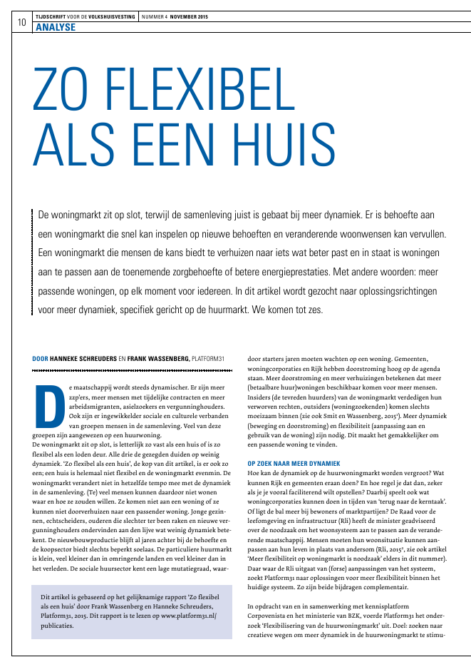 De woningmarkt zit op slot, terwijl de samenleving juist is gebaat bij meer dynamiek. Er is behoefte aan een woningmarkt die snel kan inspelen op nieuwe behoeften en veranderende woonwensen kan vervullen. Een woningmarkt die mensen de kans biedt te verhuizen naar iets wat beter past en in staat is woningen aan te passen aan de toenemende zorgbehoefte of betere energieprestaties. Met andere woorden: meer passende woningen, op elk moment voor iedereen. In dit artikel wordt gezocht naar oplossingsrichtingen voor meer dynamiek, specifiek gericht op de huurmarkt. We komen tot zes.